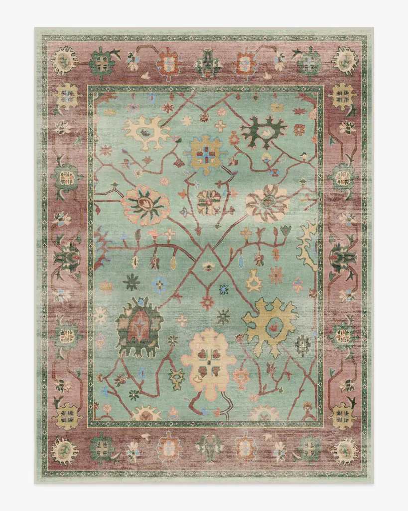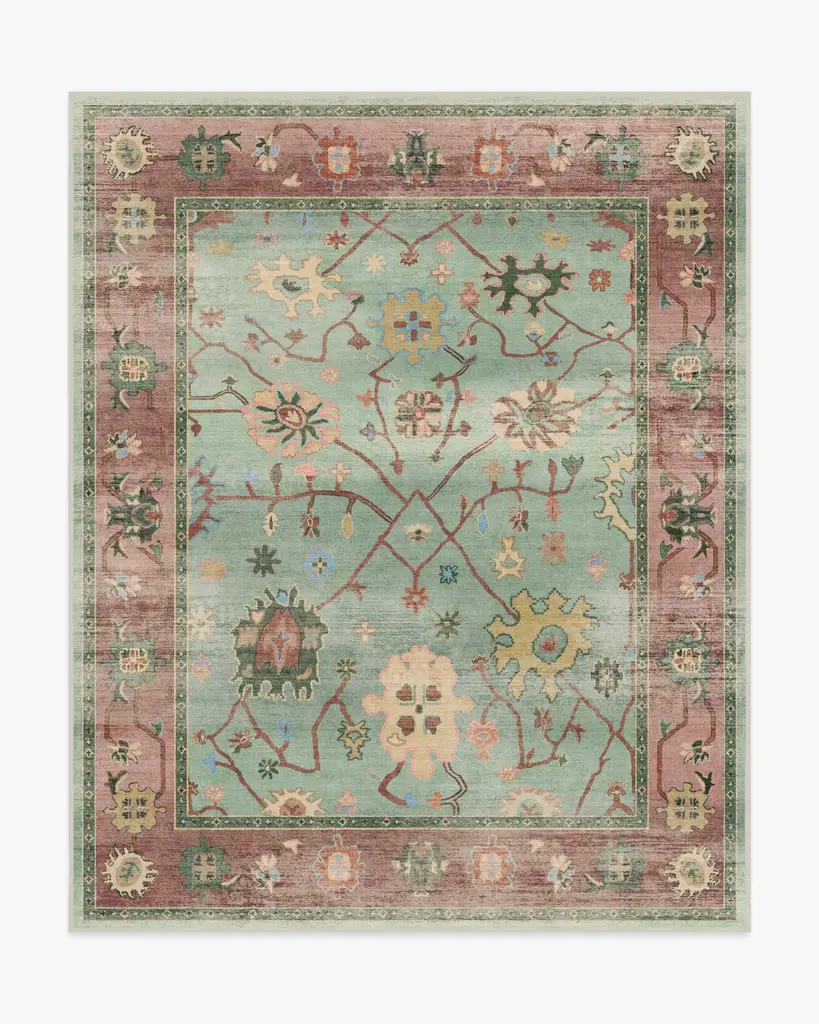 Bring the romance with our Regency-era Jemima Sage and Rosewood Rug. Inspired by timeless Oushak rugs, this opulent design features a soothing sage green background with a rich cherry wood border, accented by light, medium, and dark greens. Water-resistant, stain-resistant, and machine-washable. Rug colors may vary slightly according to your device and the lighting in your space.