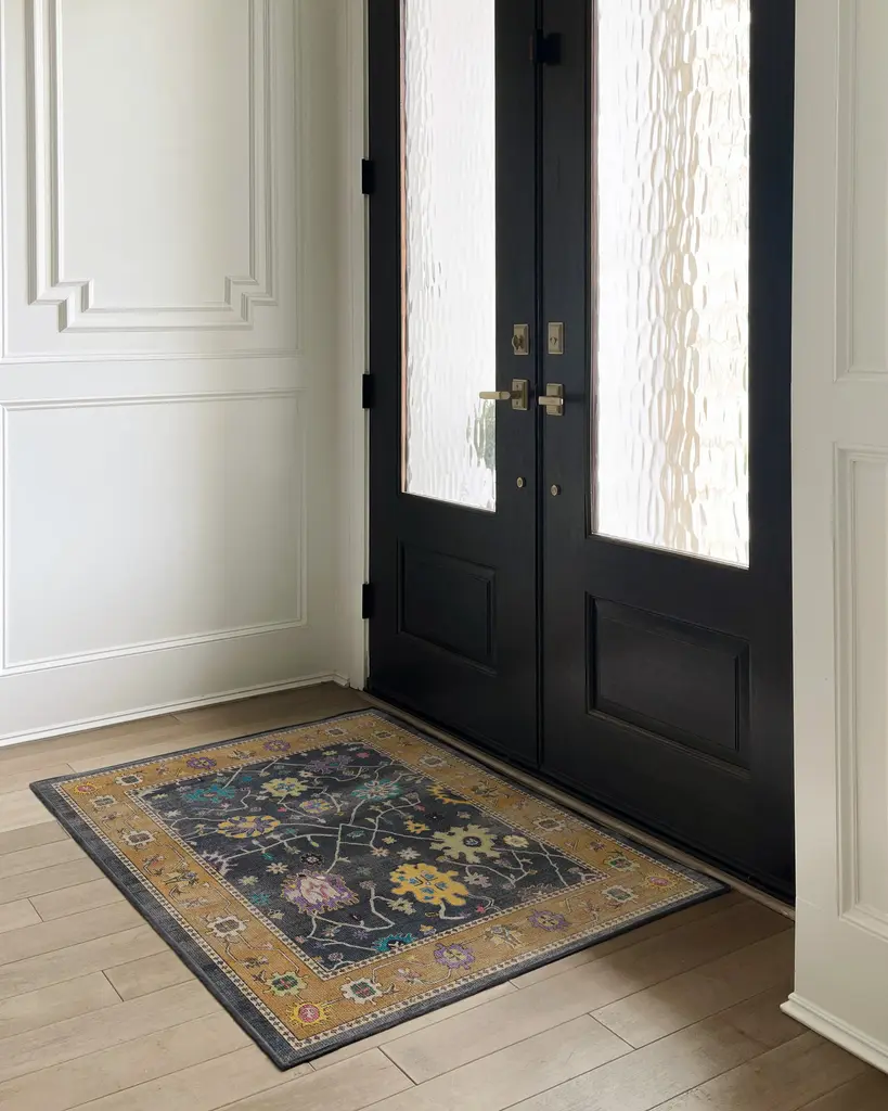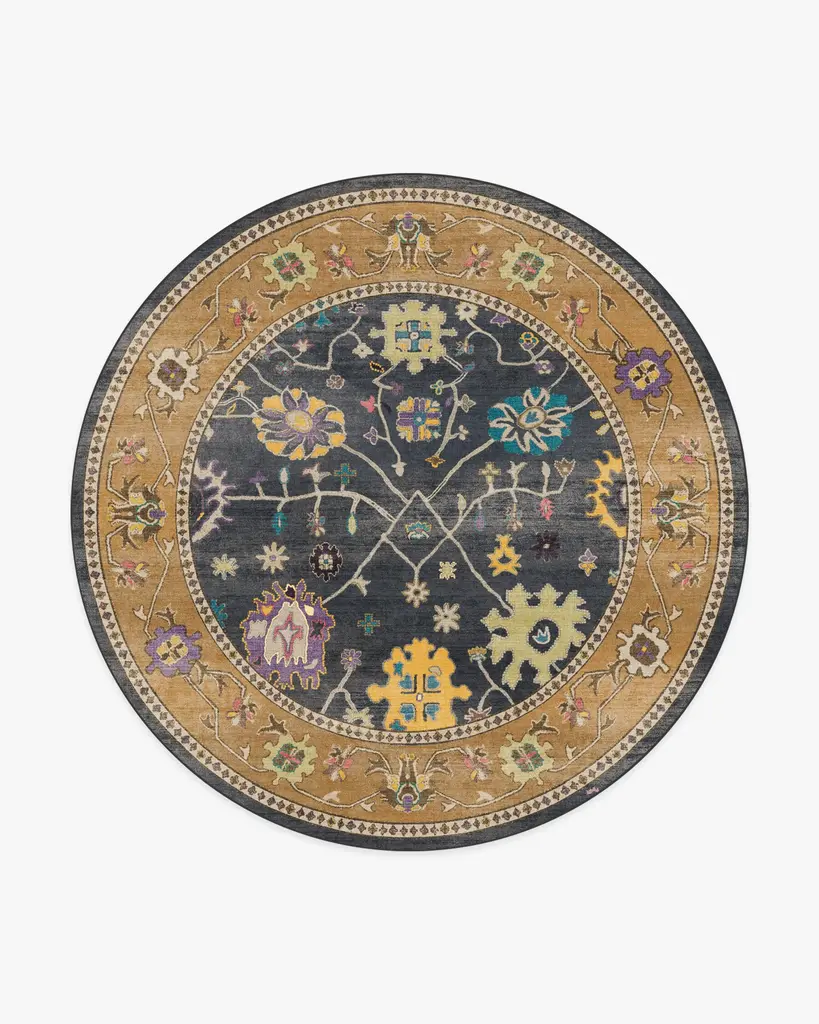 Bring the romance with our Regency-era Jemima Vintage Ink Multicolor Rug. Inspired by timeless Oushak rugs, this opulent design features a cool charcoal background with a deep desert sand border, accented by pops of warm and cool violets, golden yellow, beechnut green, light blue, and candy pink. Water-resistant, stain-resistant, and machine-washable. Rug colors may vary slightly according to your device and the lighting in your space.