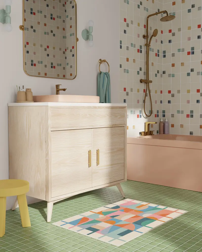 Welcome home vibrancy and playfulness with our Jennie Multicolor Rug. This geometric design features bold, asymmetrically aligned shapes that fit together in a jovial grid pattern, bringing fun and energy to any room. This rug showcases multicolor pops of light and dark blues, teals, corals, oranges, and pinks, all beautifully grounded by soft neutrals and a light cream background. A simple linear border allows the lively field to breathe. Water-resistant, stain-resistant, and machine-washable. Rug colors may vary slightly according to your device and the lighting in your space.