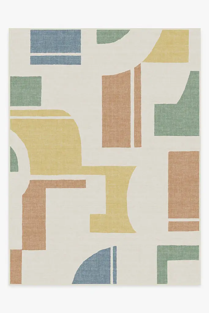 Welcome home vibrancy and playfulness with our Jennie Multicolor Rug. This geometric design features bold, asymmetrically aligned shapes that fit together in a jovial grid pattern, bringing fun and energy to any room. This rug showcases multicolor pops of light and dark blues, teals, corals, oranges, and pinks, all beautifully grounded by soft neutrals and a light cream background. A simple linear border allows the lively field to breathe. Water-resistant, stain-resistant, and machine-washable. Rug colors may vary slightly according to your device and the lighting in your space.