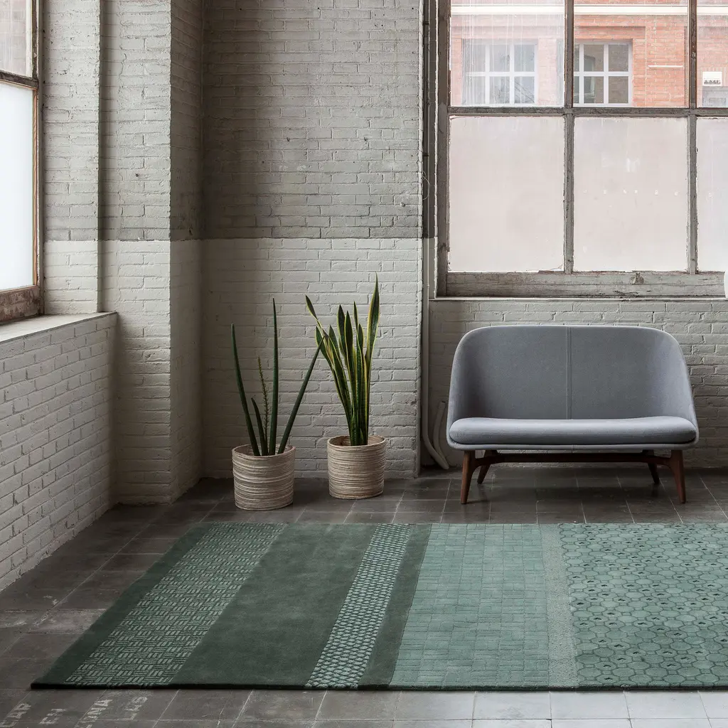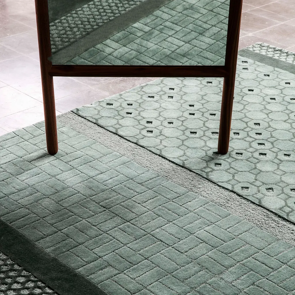 Neri & Hu takes inspiration from the tile patterns of Shanghai streets, a place where life literally happens. The name of the collection corresponds to Jie 街, the Chinese character that embodies the essence of a city: the constant movement, dynamism and frenetic activity. “The character “Jie” is made up of a radical and a phonetic character. The ancient ideograms of the Chinese Jie character depicts on one side the street as an intersection, evoking “life” at the crossroads, while the center portion of the character is made up of two “earth” characters whose ideogram shows a clay on potter’s wheel… a connection to the ceramic colors used by Neri&Hu in the series.”, according to Neri & Hu. The result is an eclectic hand-tufted rug presenting different pile heights and finishes, made of 100% New wool.