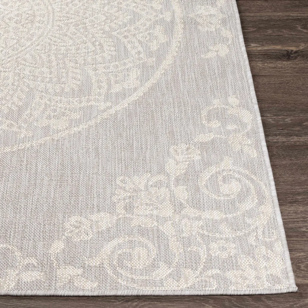 Collection: Jilliby Colors: Ivory, Gray Construction: Machine Woven Material: 67% Polypropylene,33% Polyester Pile: No Pile Styles: Traditional Outdoor Safe: Yes Made In: Turkey Thickness: 0.2" Price Range: $$$$$ (Most Affordable)