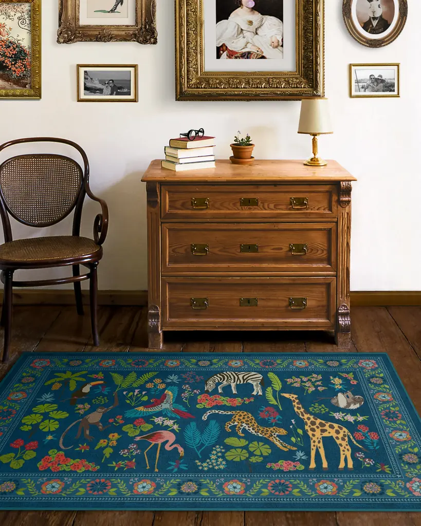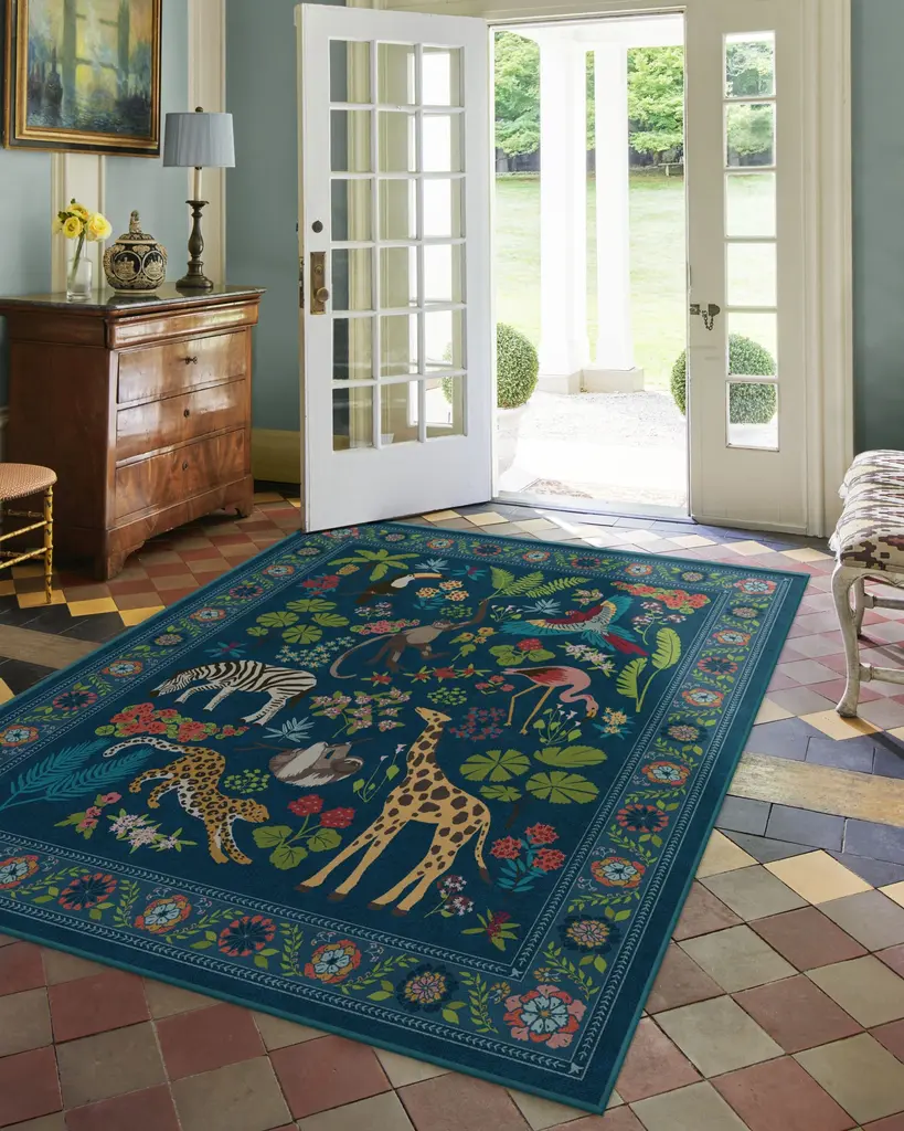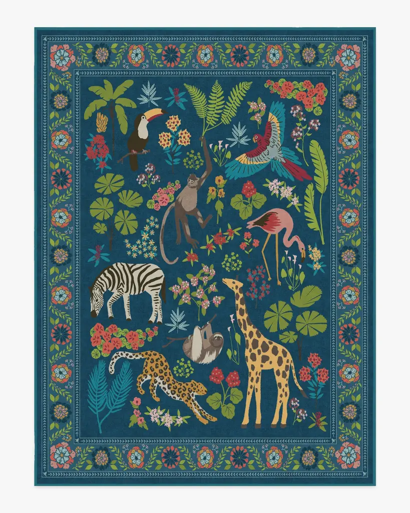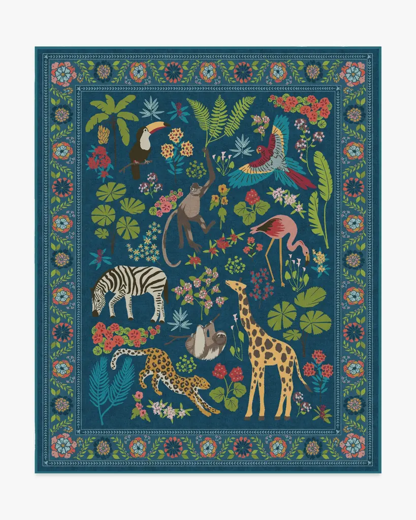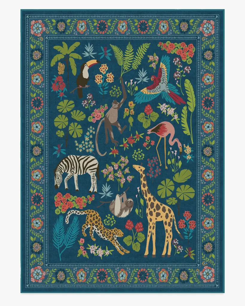 Dare to be iconic with our Iris Apfel Jingle Jungle Royal Blue Rug. Inspired by Iris' adventurous spirit, this wildlife-filled design features exotic animals roaming among lush foliage. A vivid color palette with splashes of yellow, bright blue, green, cool pink, and beige pops against a royal blue background. Water-resistant, stain-resistant, and machine-washable. Rug colors may vary slightly according to your device and the lighting in your space.