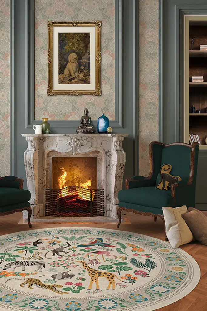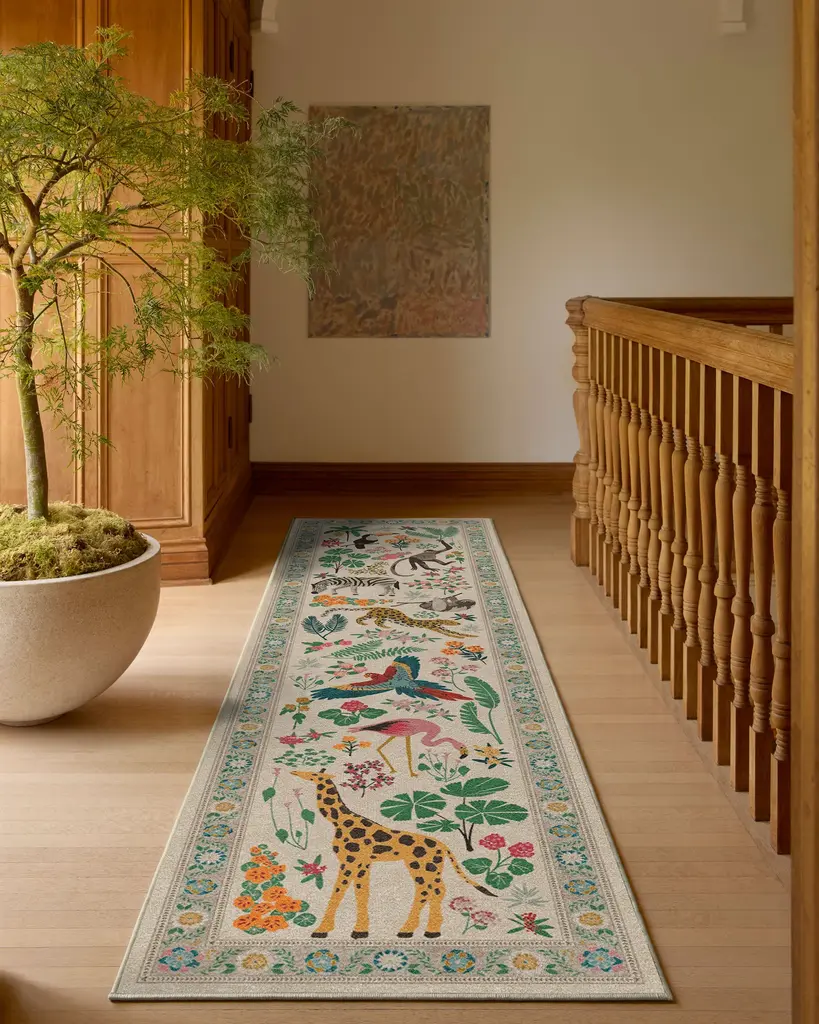 Take a walk on the wild side. Our Iris Apfel Jingle Jungle Rug draws inspiration from the fashion icon's love of animal figurines she's collected on her travels. This lively design features a delightful assortment of animals - monkeys, sloths, giraffes, zebras, and more - surrounded by tropical flora. The bold and bright color palette is contrasted against a neutral background that allows the motifs to stand out to the eye. Made from our water-resistant, stain-resistant, and machine-washable low-pile Chenille material.