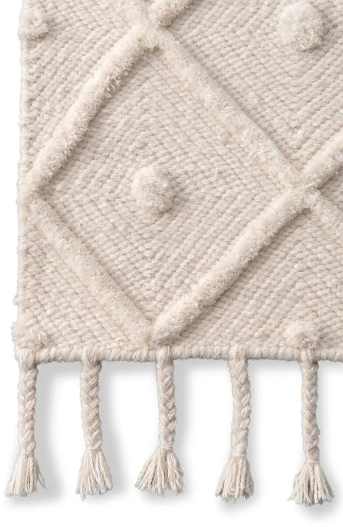 Hand-loomed of wool and cotton in a tonal Moroccan-style design with braided tassels, this rug delivers dynamic texture and effortless style to any room. We recommend a rug pad to extend the life of your rug and keep it securely in place.