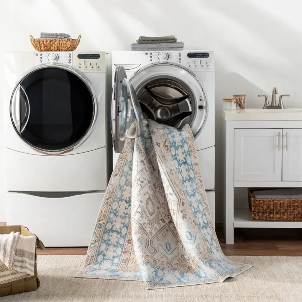 This area rug has all the charm of a vintage find with its soft hues and lived-in design. It's woven from polyester, and it features an all-over medallion pattern inspired by classic Persian textiles. We love how the super low 0.16'' pile height makes this rug great for busy areas. Plus, it's stain-resistant, making it a smart choice in homes with kids or pets. Pro-tip: Pair this piece with a rug pad for added cushion and to help keep it in place.