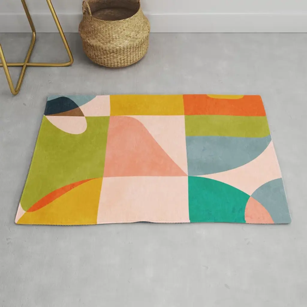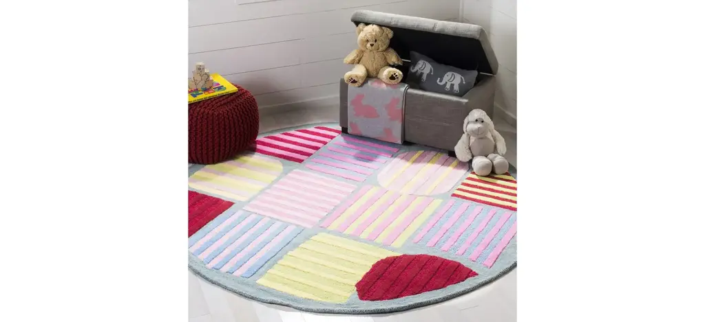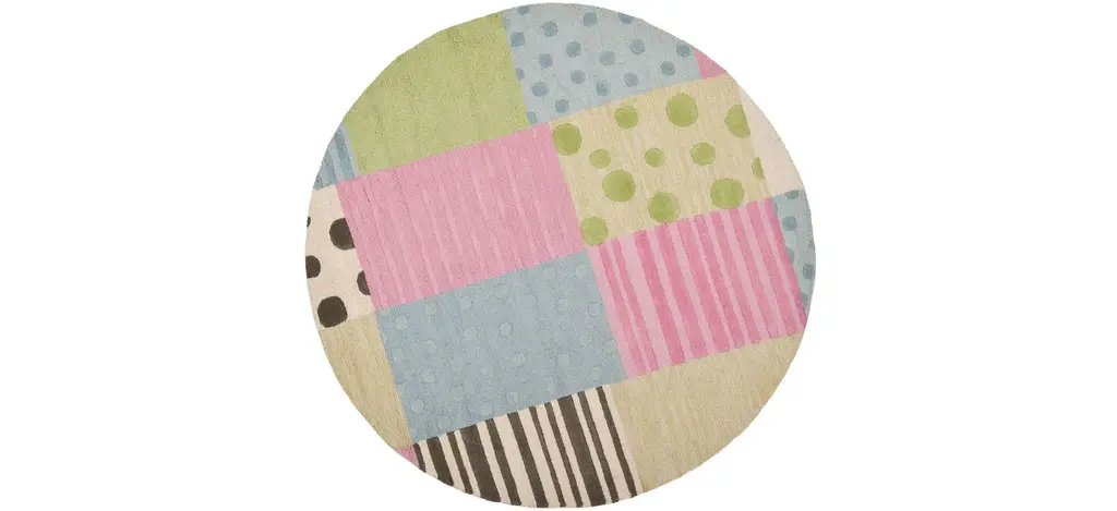 The Joelle Kid's Rug features a colorful design with geometric shapes for a fun addition to your kid's room. These rugs are made with pure soft wool and hand-tufted to a cotton backing for added cushion.