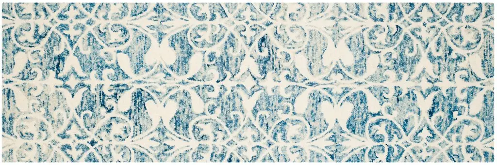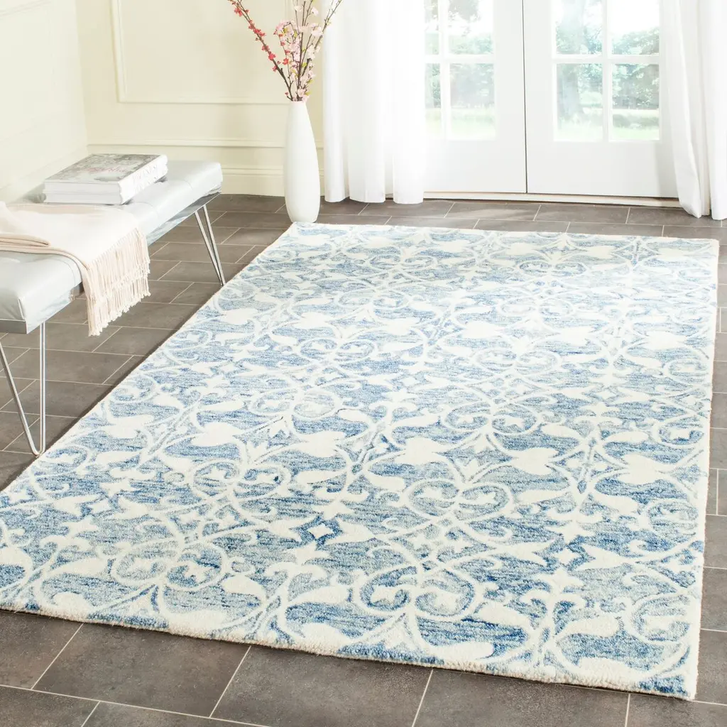 This wool rug shows off an elegant allover design in blue and ivory. We recommend a rug pad to keep the rug securely in place and provide an extra layer of cushioning.