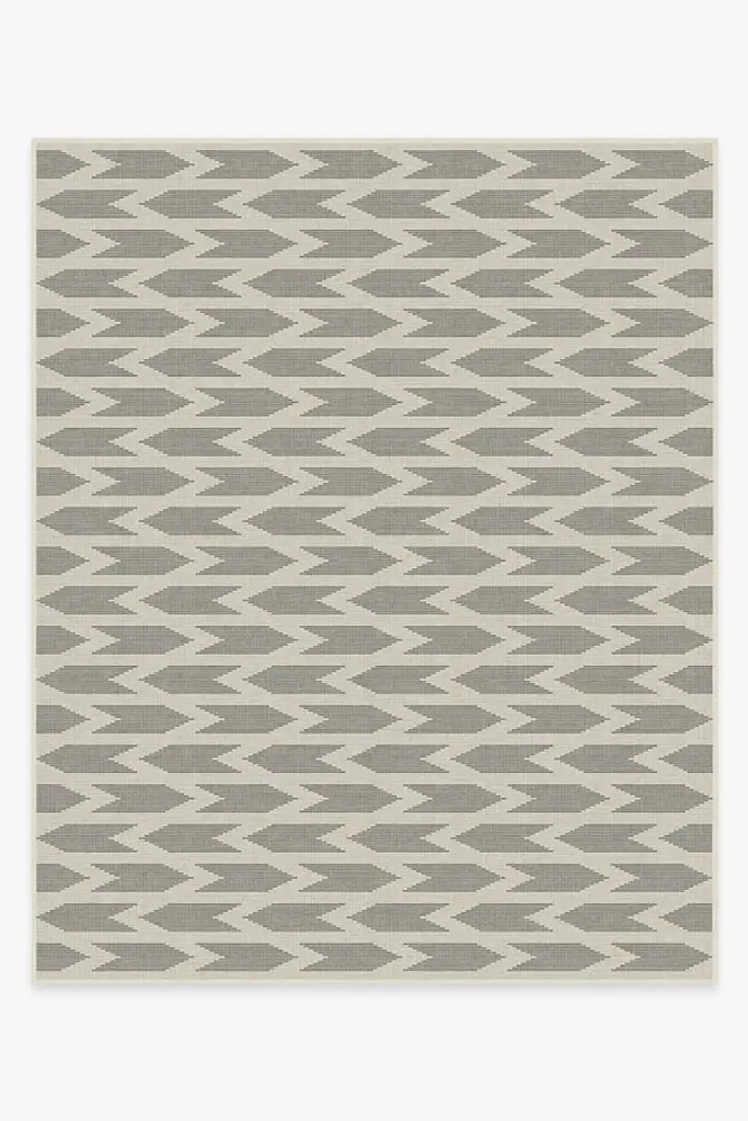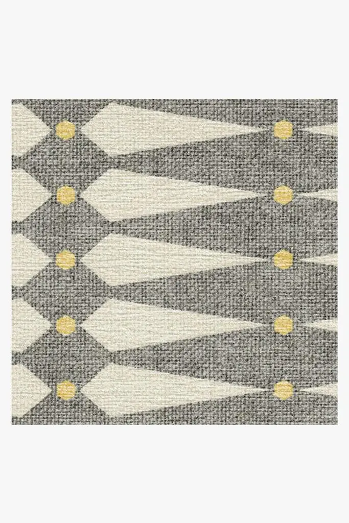 A delightful mix of diamonds and dots. This geometric rug features a stunning pattern of elongated diamonds punctuated by dots, forming a tiled pattern in shades of neutral grey with pops of warm ivory and sunny yellow. Water-resistant, stain-resistant, and machine-washable.
