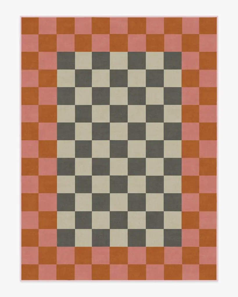 Indulge in modern glamour with our Jonathan Adler Checker Border Pink & Orange Rug. This bold take on a classic checkerboard design pairs bright pink and orange with soft grey and cream accents for a cheerful statement. Water-resistant, stain-resistant, and machine-washable. Rug colors may vary slightly according to your device and the lighting in your space.