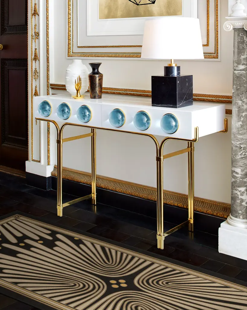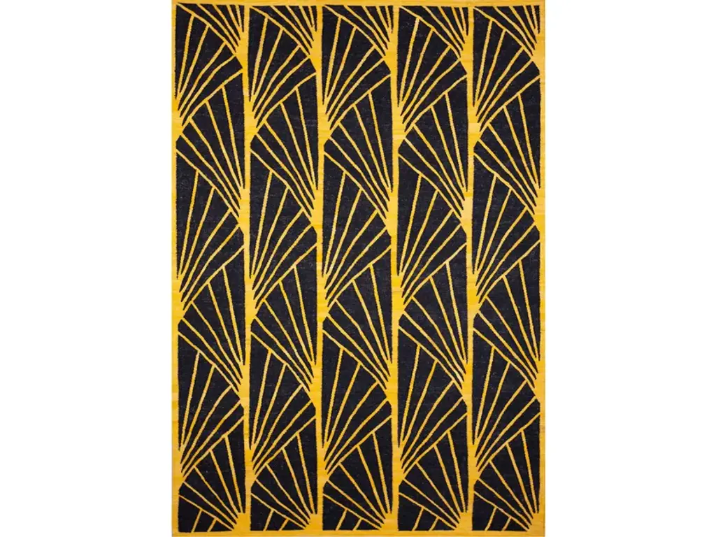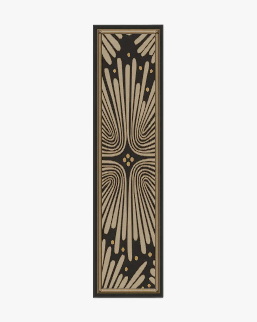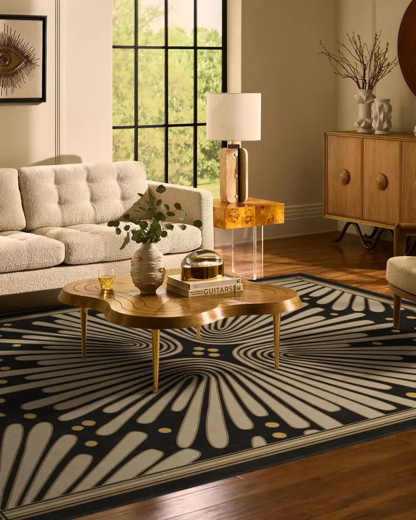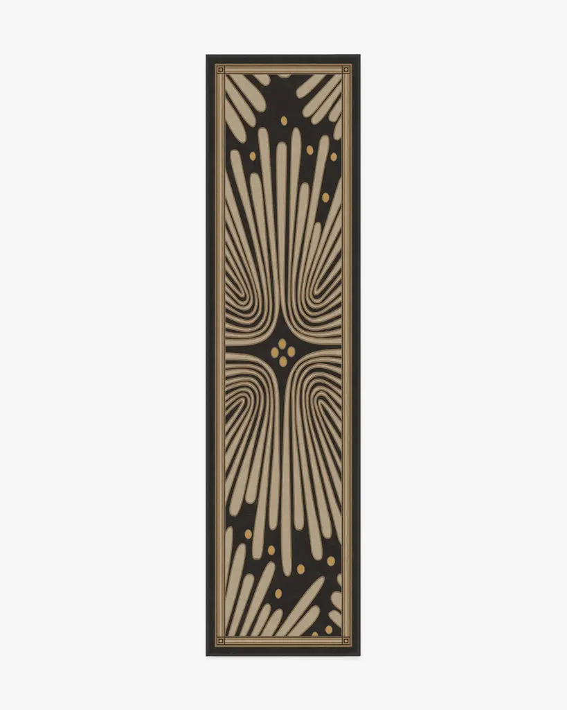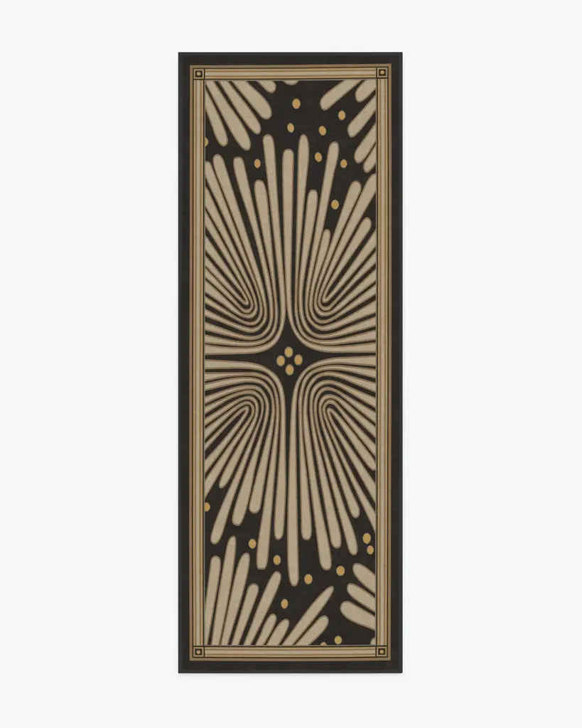 Let's party! Bring home jazz-age glamour with our Jonathan Adler Gatsby Black & Gold Rug. This bold design features a cream floral motif against a soft black background, creating a striking contrast that adds an air of sophistication to any room. Water-resistant, stain-resistant, and machine-washable. Rug colors may vary slightly according to your device and the lighting in your space.