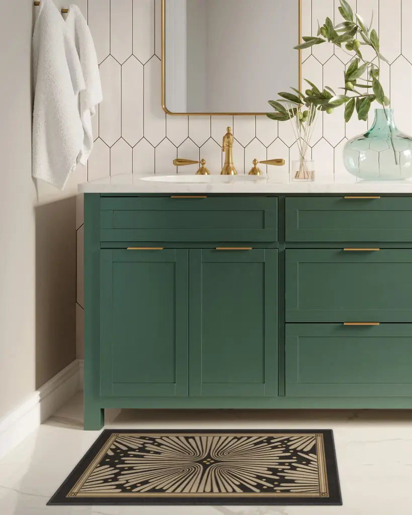 Let's party! Bring home jazz-age glamour with our Jonathan Adler Gatsby Black & Gold Rug. This bold design features a cream floral motif against a soft black background, creating a striking contrast that adds an air of sophistication to any room. Water-resistant, stain-resistant, and machine-washable. Rug colors may vary slightly according to your device and the lighting in your space.
