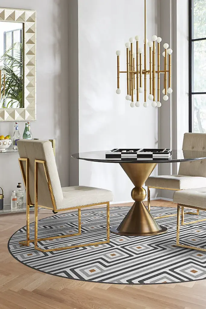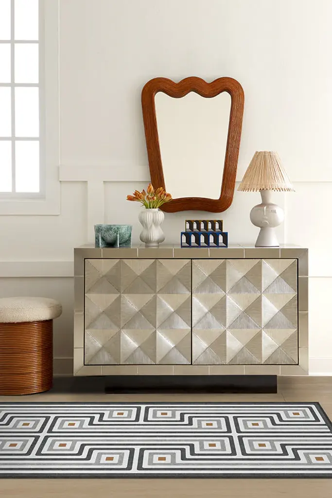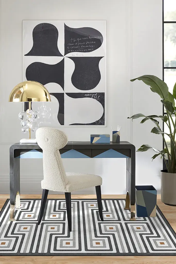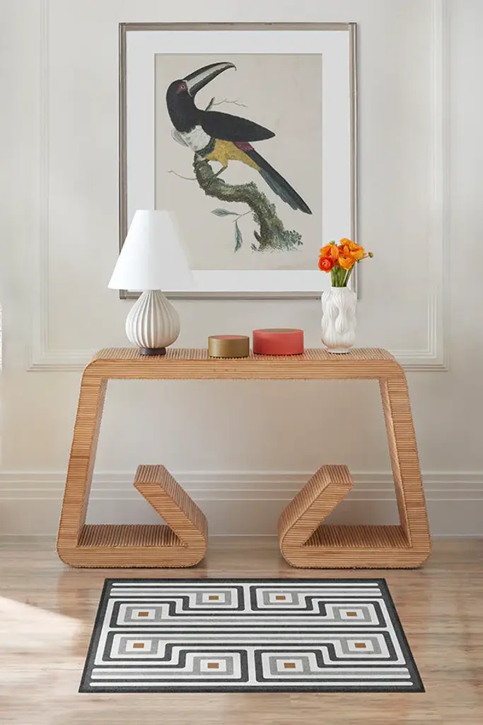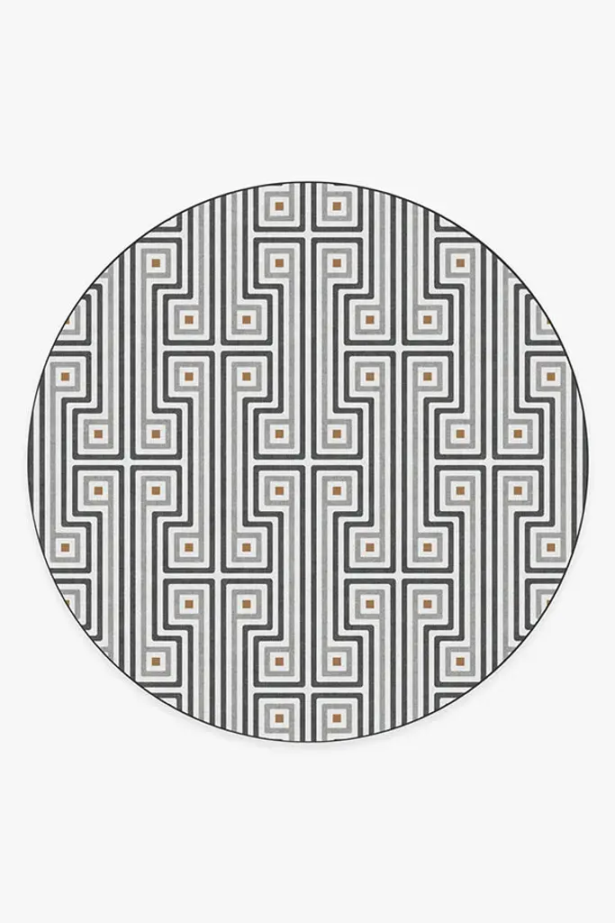 A deconstructed twist on a traditional Greek key: interlocking and elegant. Our Jonathan Adler Greenwich Grey Rug features a geometric pattern in shades of charcoal and light grey with subtle pops of dijon yellow. Water-resistant, stain-resistant, and machine-washable.