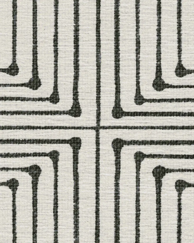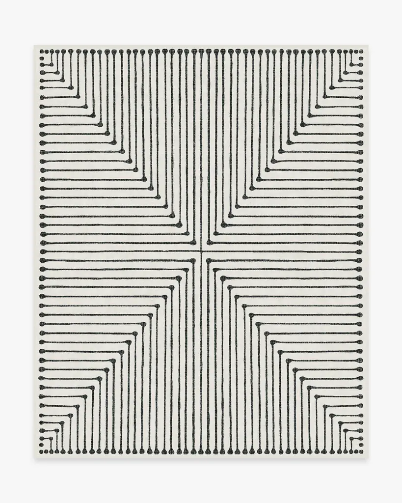 Stripes get a chic makeover. Ink-inspired lines form a striped, geometric pattern on this black and ivory rug. Water-resistant, stain-resistant, and machine-washable.