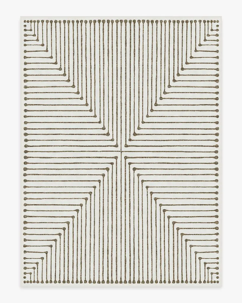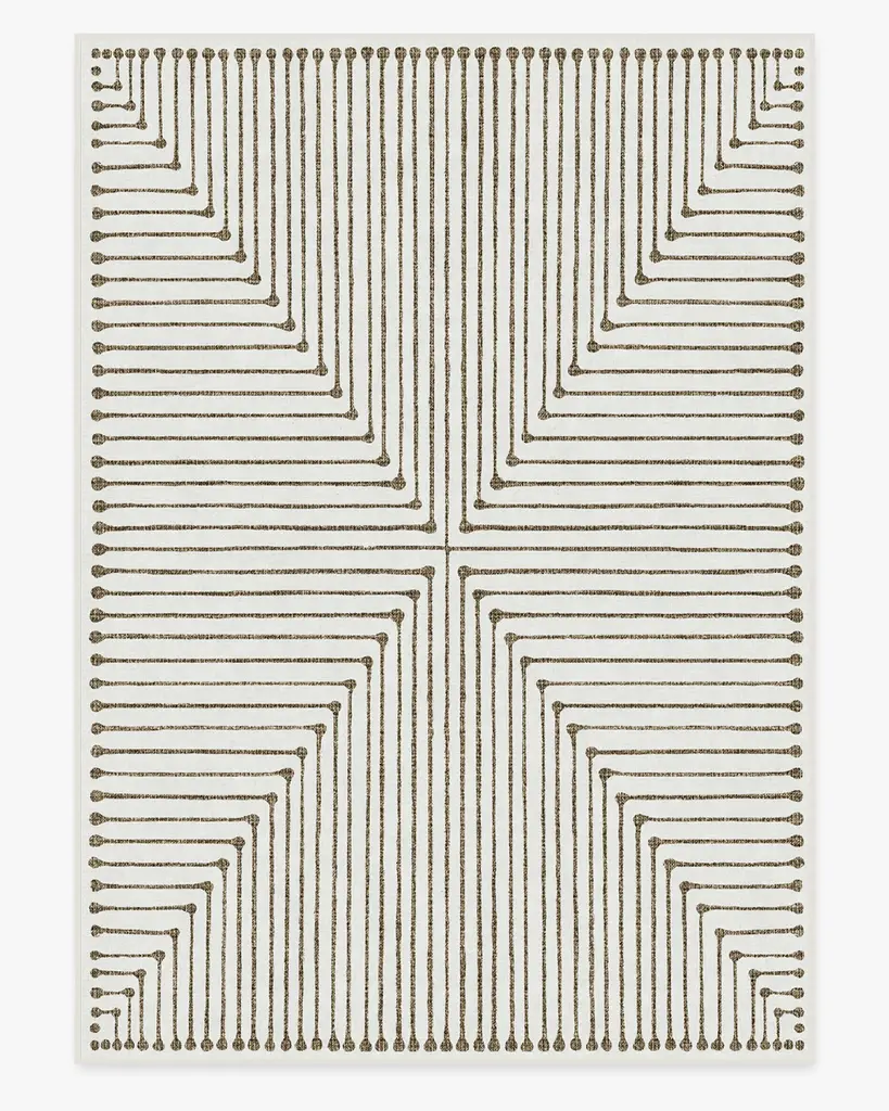 Elevate a warm oak floor. This versatile geometric rug can dress up any space with its simple pattern, glammed up by ink-inspired lines in camel brown on an ivory background. Water-resistant, stain-resistant, and machine-washable.
