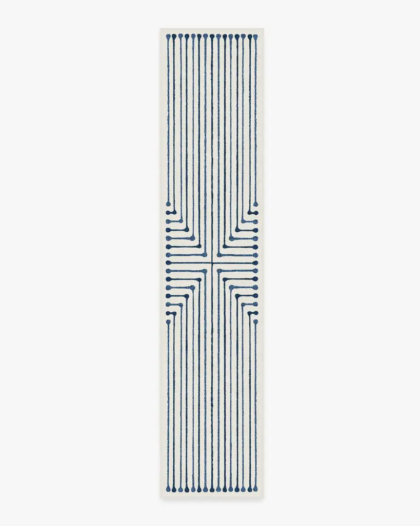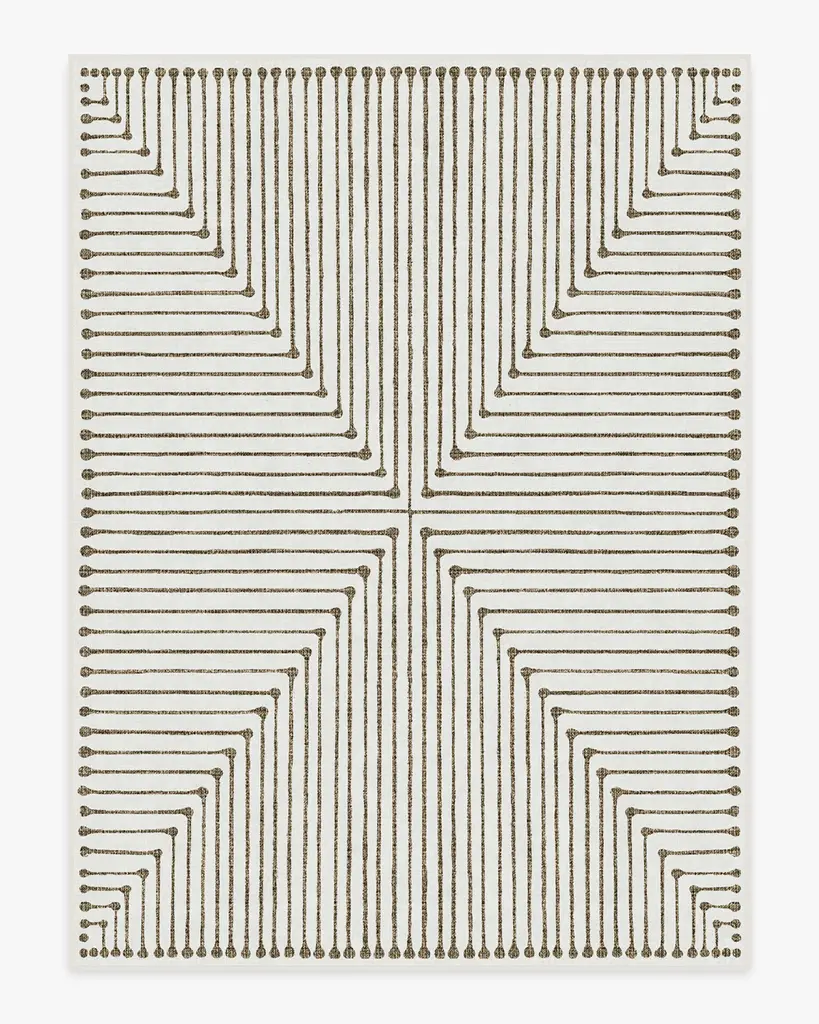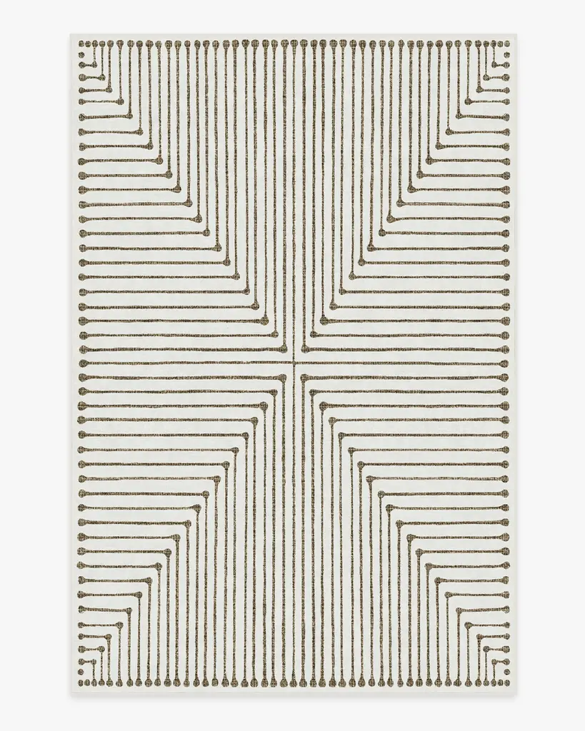 Elevate a warm oak floor. This versatile geometric rug can dress up any space with its simple pattern, glammed up by ink-inspired lines in camel brown on an ivory background. Water-resistant, stain-resistant, and machine-washable.