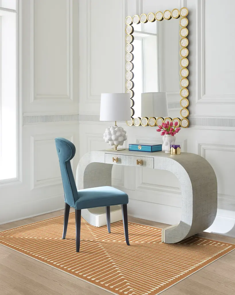 Stripes get a chic makeover in the Jonathan Adler Inkdrop Copper Rug. Ink-inspired lines form a striped, geometric pattern on this rust orange and ivory rug. Water-resistant, stain-resistant, and machine-washable. Rug colors may vary slightly according to your device and the lighting in your space.