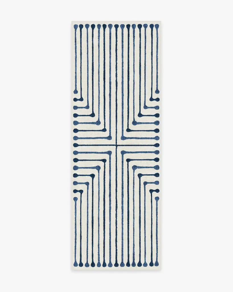 Effortlessly glam. Ink-inspired lines make up a striking triangular design on this geometric rug, beautifully done in shades of dark and light blue on an ivory background. Water-resistant, stain-resistant, and machine-washable.