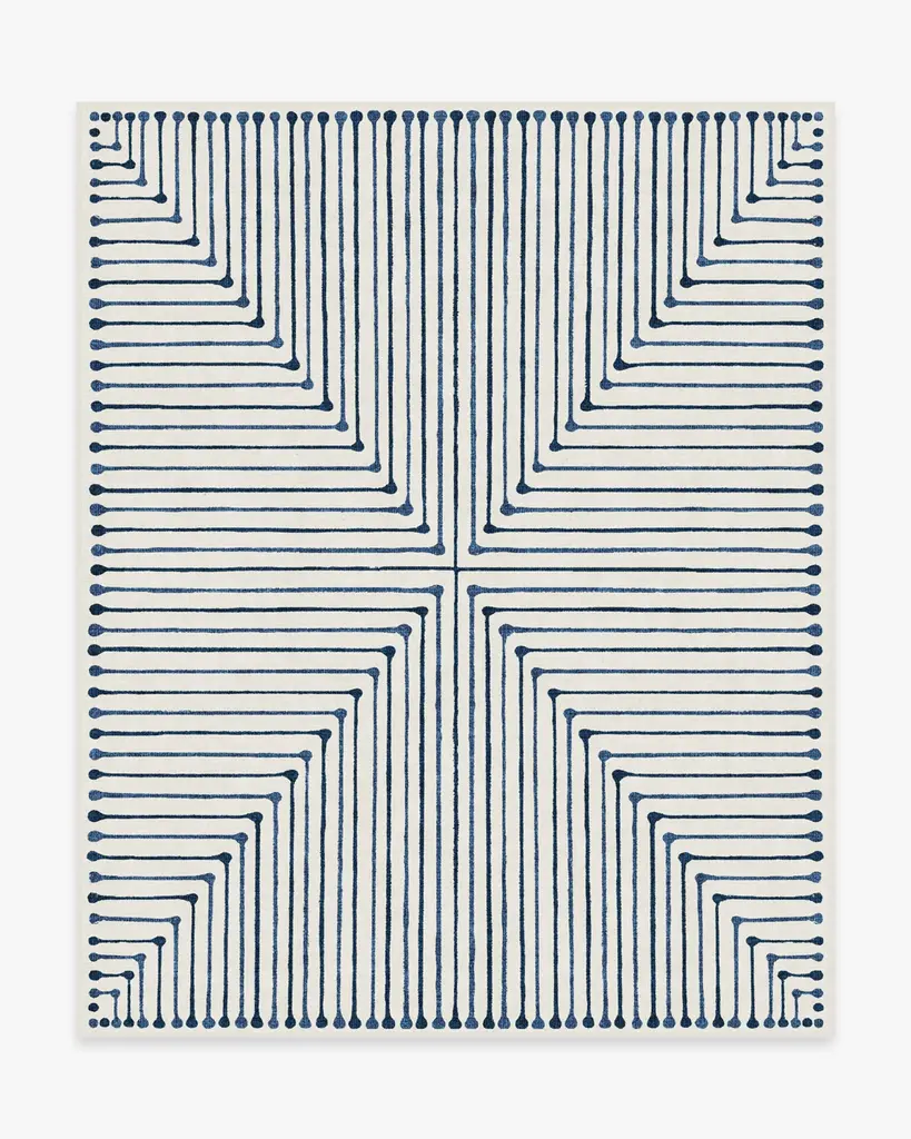 Effortlessly glam. Ink-inspired lines make up a striking triangular design on this geometric rug, beautifully done in shades of dark and light blue on an ivory background. Water-resistant, stain-resistant, and machine-washable.