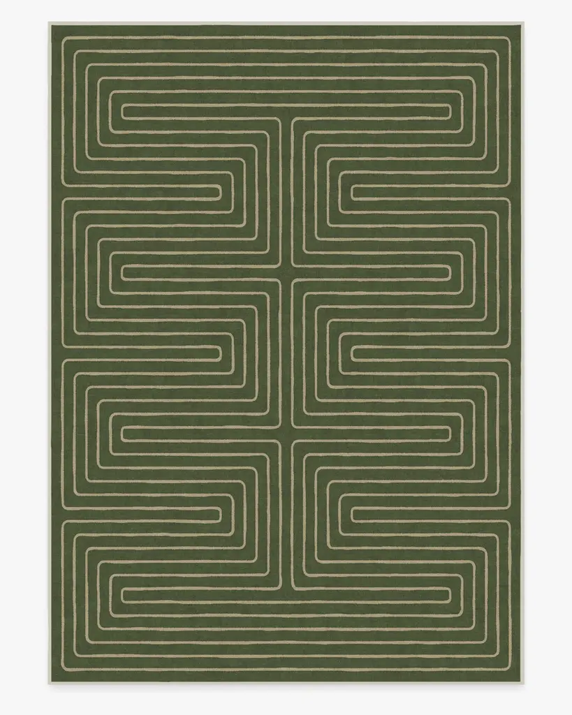 Irregular linework inspired by hand-cut paper softens a large scale maze pattern. Our Jonathan Adler Labyrinth Fern Green Rug features a continuous neutral line with a hand-drawn feel on a rich green background. Water-resistant, stain-resistant, and machine-washable. Rug colors may vary slightly according to your device and the lighting in your space.