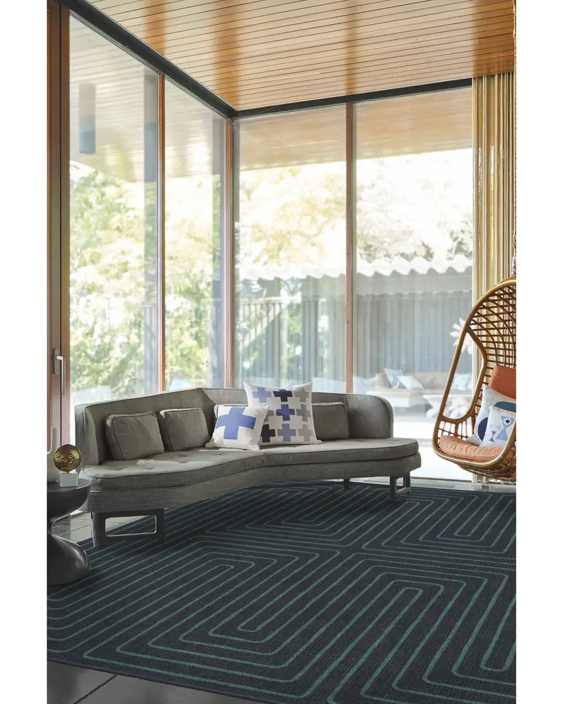 Irregular linework inspired by hand-cut paper softens a large scale maze pattern. Our Jonathan Adler Labyrinth Navy and Teal Rug features a continuous line with a hand-drawn feel in teal on a navy background. Water-resistant, stain-resistant, and machine-washable.