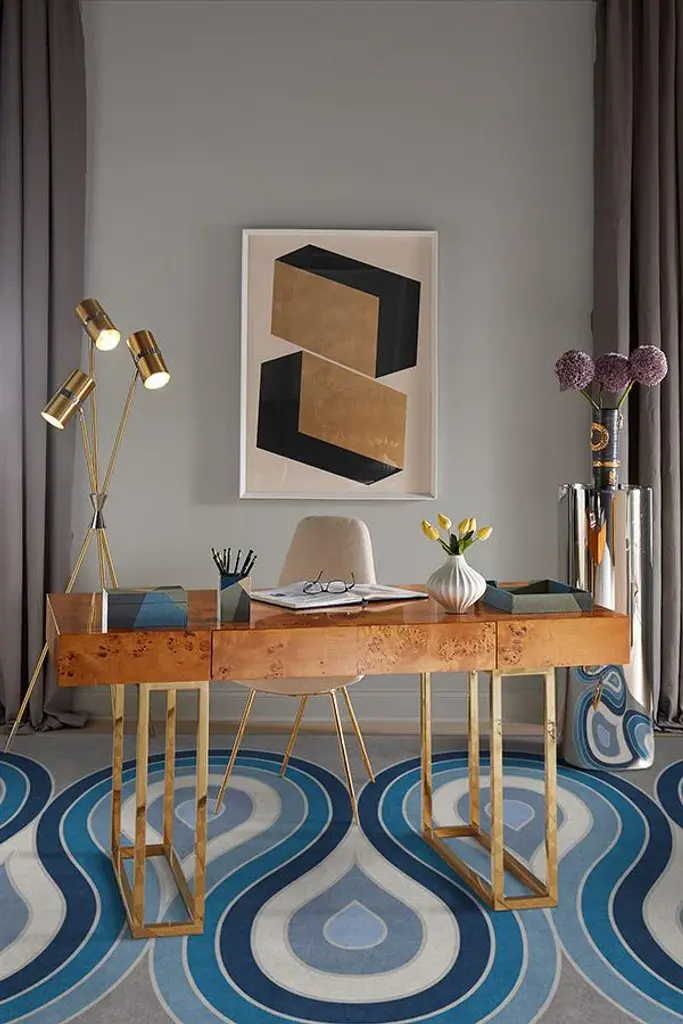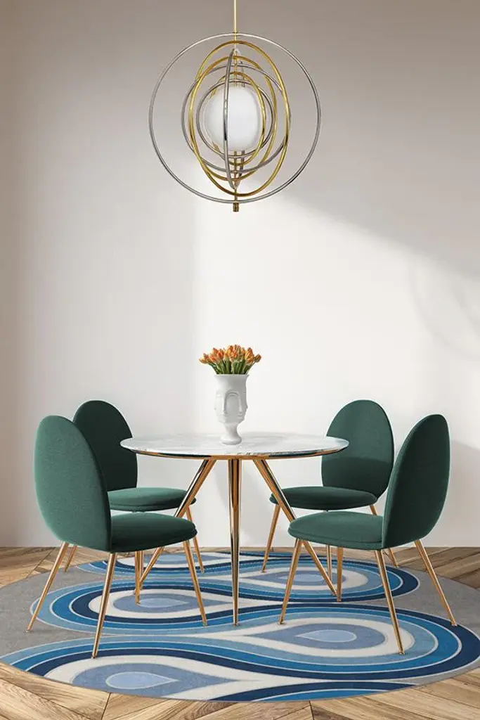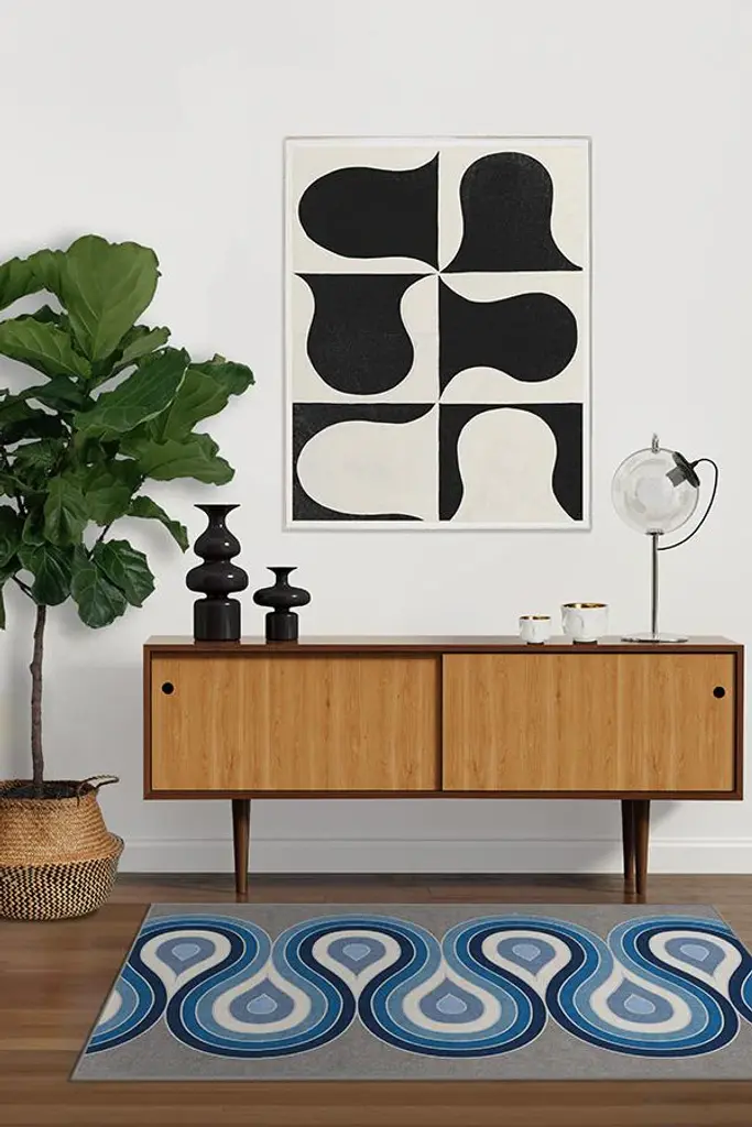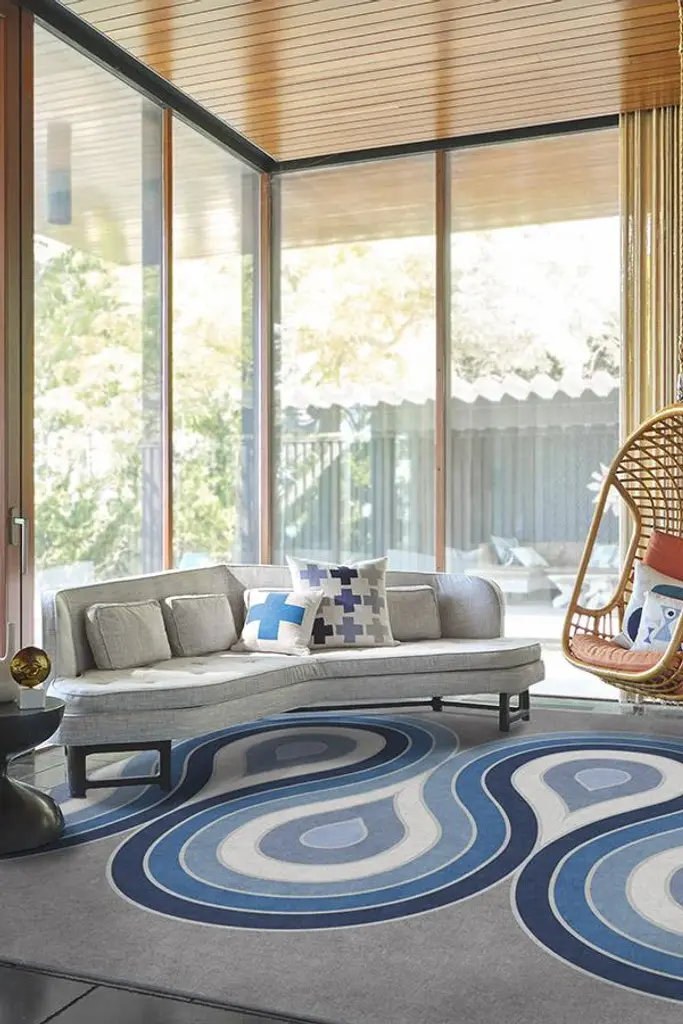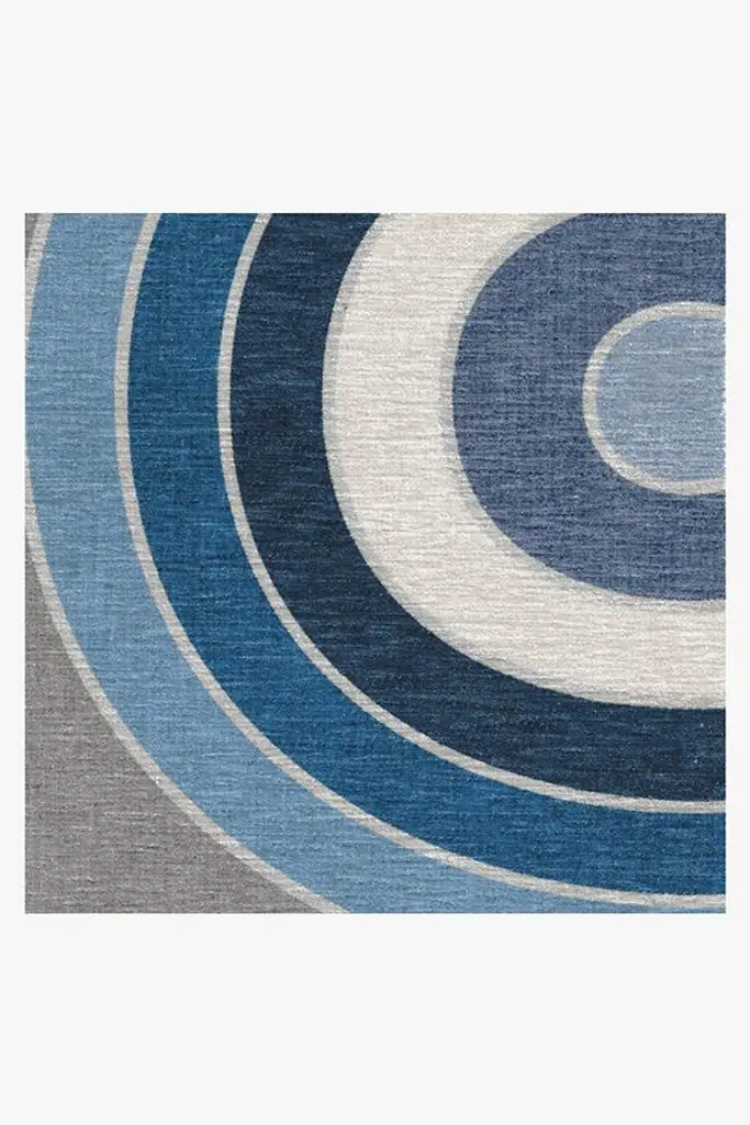 Fun, flowy, and fabulous. This rug features a continuous, multi-layered curve in shades of brilliant blue hues with pops of pearl on a grey background. Water-resistant, stain-resistant, and machine-washable.