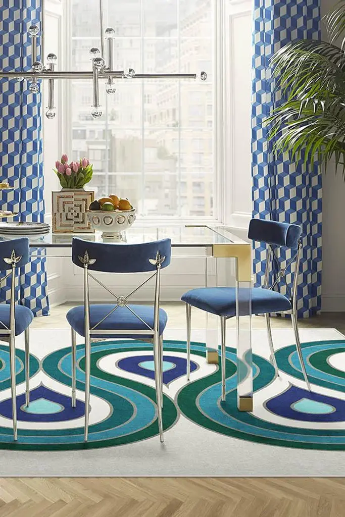 As posh as a peacock. This rug features a whimsical wave pattern in a peacock-inspired palette of emerald green, turquoise blue, royal blue, and mint green on an off-white background. Water-resistant, stain-resistant, and machine-washable.