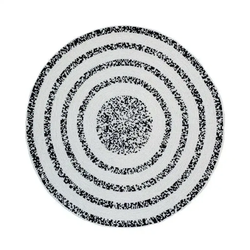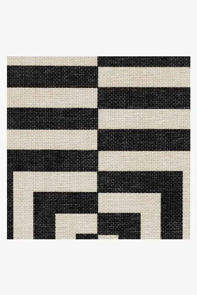 Graphic go-anywhere funster. This charcoal and off-white geometric rug mesmerizes with its dynamic, op art-inspired pattern. Water-resistant, stain-resistant, and machine-washable.