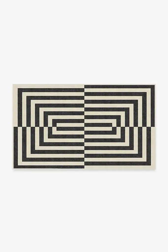Graphic go-anywhere funster. This charcoal and off-white geometric rug mesmerizes with its dynamic, op art-inspired pattern. Water-resistant, stain-resistant, and machine-washable.