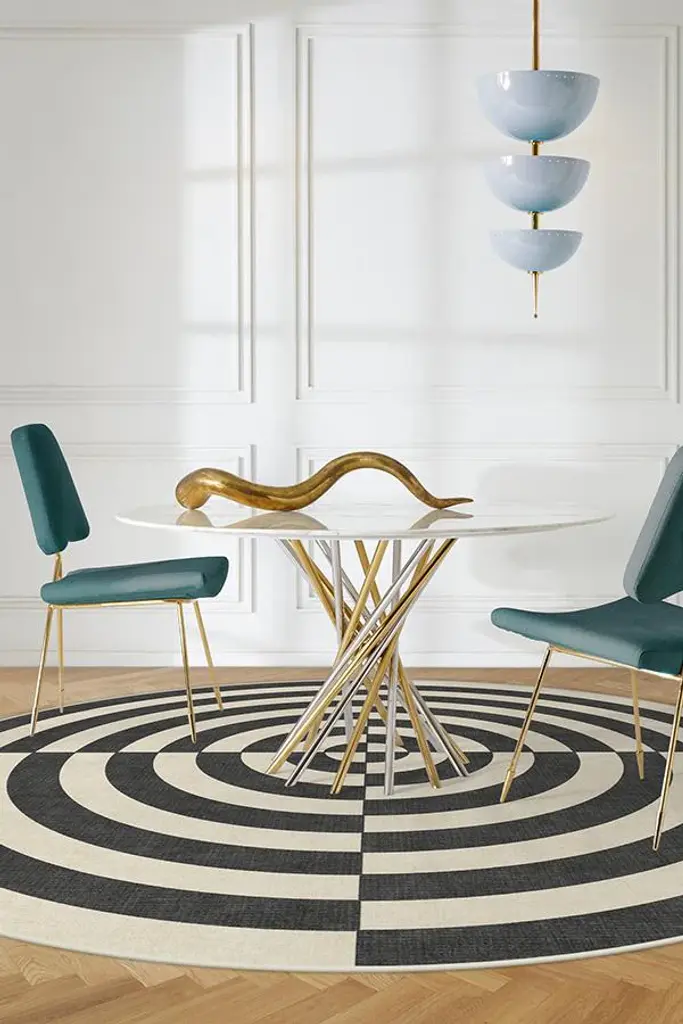 Graphic go-anywhere funster. This charcoal and off-white geometric rug mesmerizes with its dynamic, op art-inspired pattern. Water-resistant, stain-resistant, and machine-washable.