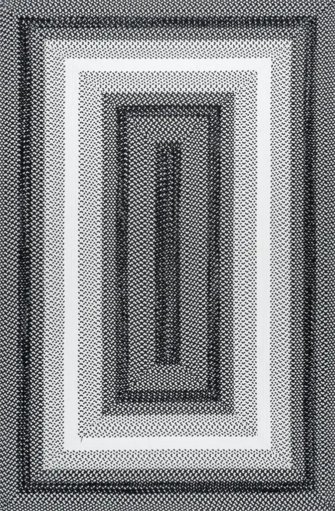 Graphic go-anywhere funster. This charcoal and off-white geometric rug mesmerizes with its dynamic, op art-inspired pattern. Water-resistant, stain-resistant, and machine-washable.