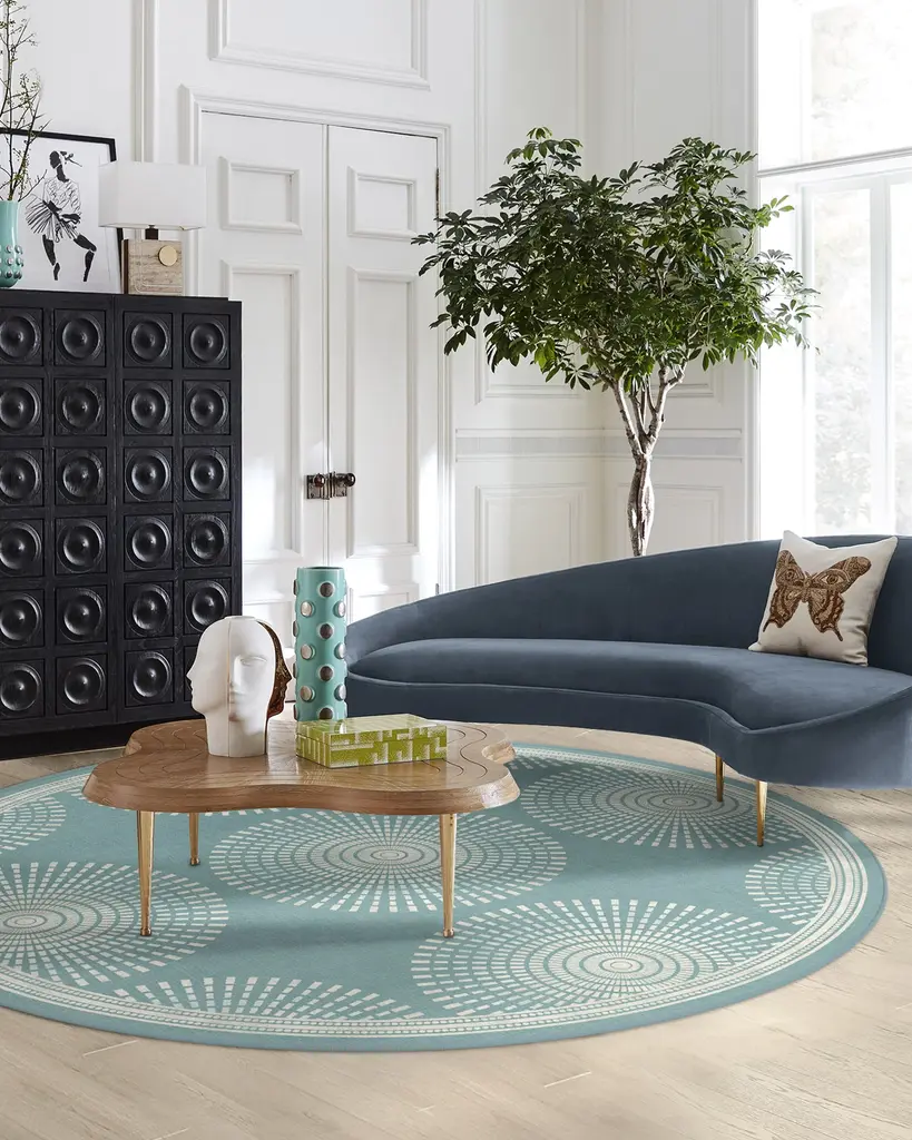 Bring home understated glamour with our Jonathan Adler Santorini Blue Rug. This geometric repetition of a radial pattern is both elegant and simple. The subtle ivory gradient seamlessly blended within each motif gives a captivating sense of depth and refinement against a sky blue background. Water-resistant, stain-resistant, and machine-washable. Rug colors may vary slightly according to your device and the lighting in your space.