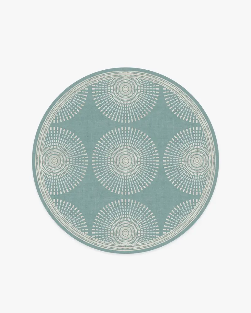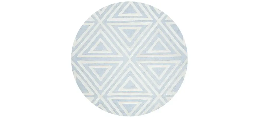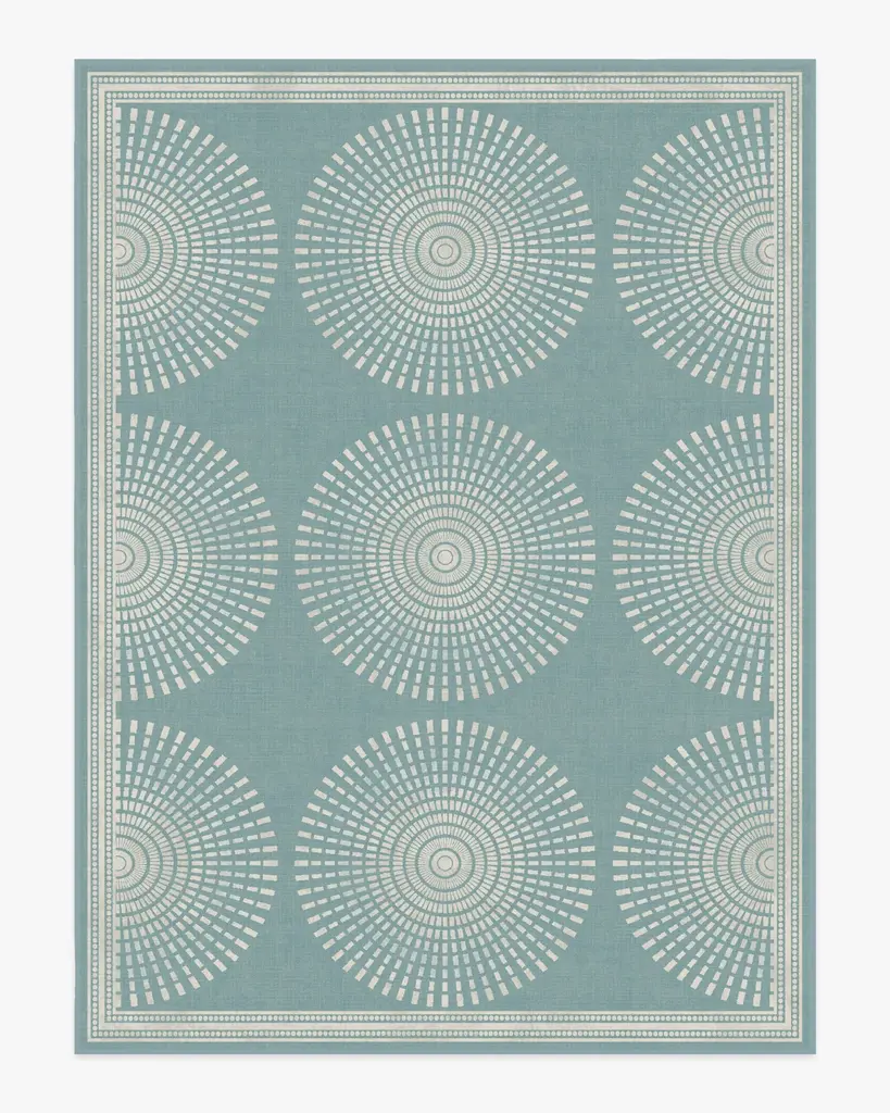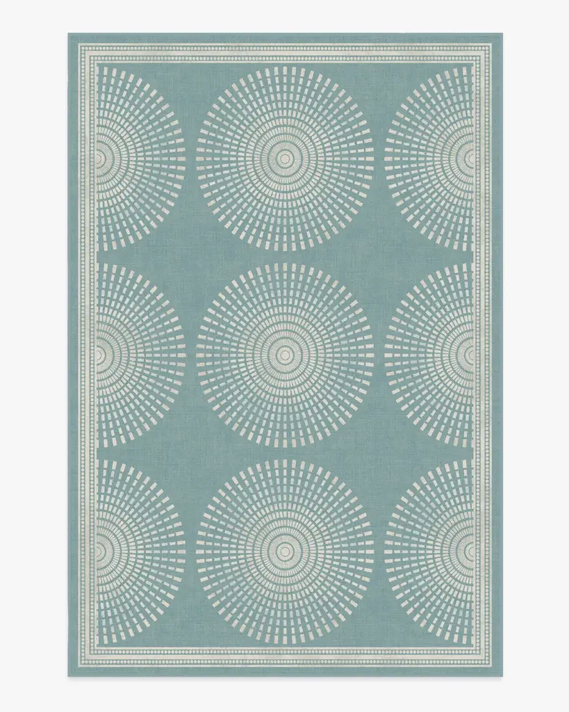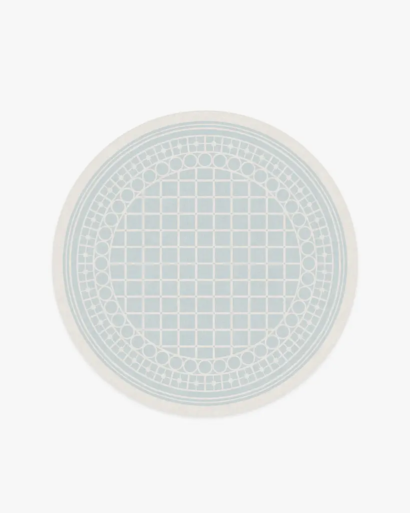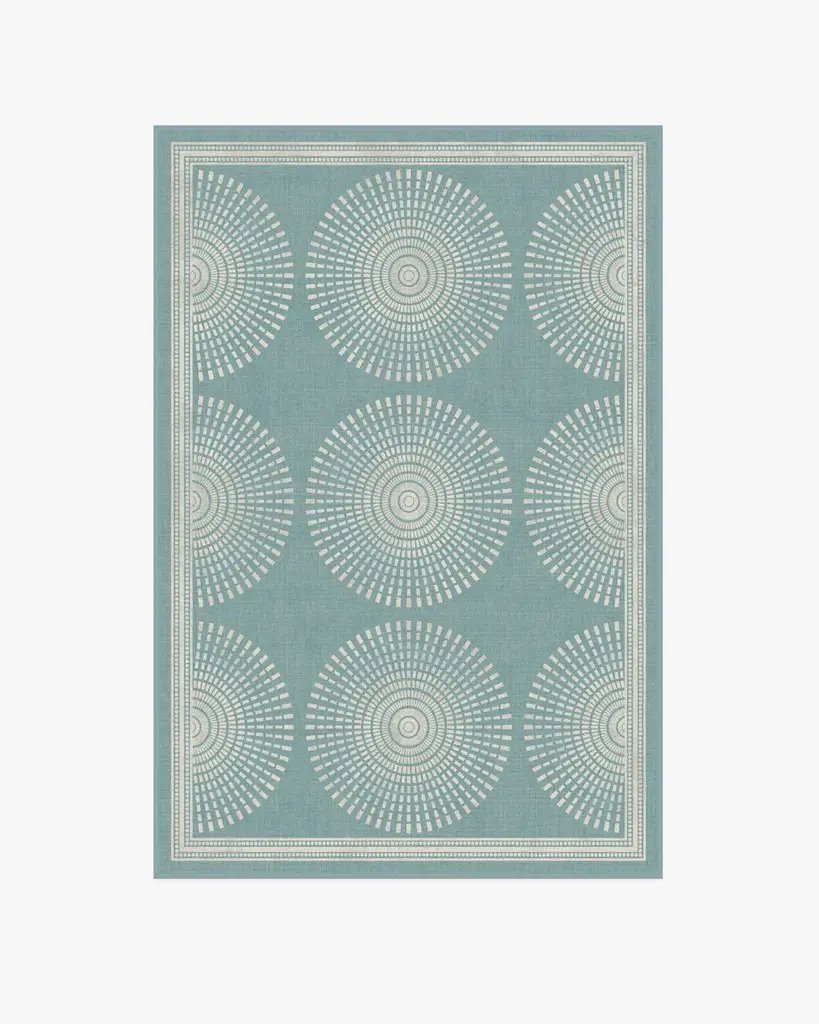 Bring home understated glamour with our Jonathan Adler Santorini Blue Rug. This geometric repetition of a radial pattern is both elegant and simple. The subtle ivory gradient seamlessly blended within each motif gives a captivating sense of depth and refinement against a sky blue background. Water-resistant, stain-resistant, and machine-washable. Rug colors may vary slightly according to your device and the lighting in your space.