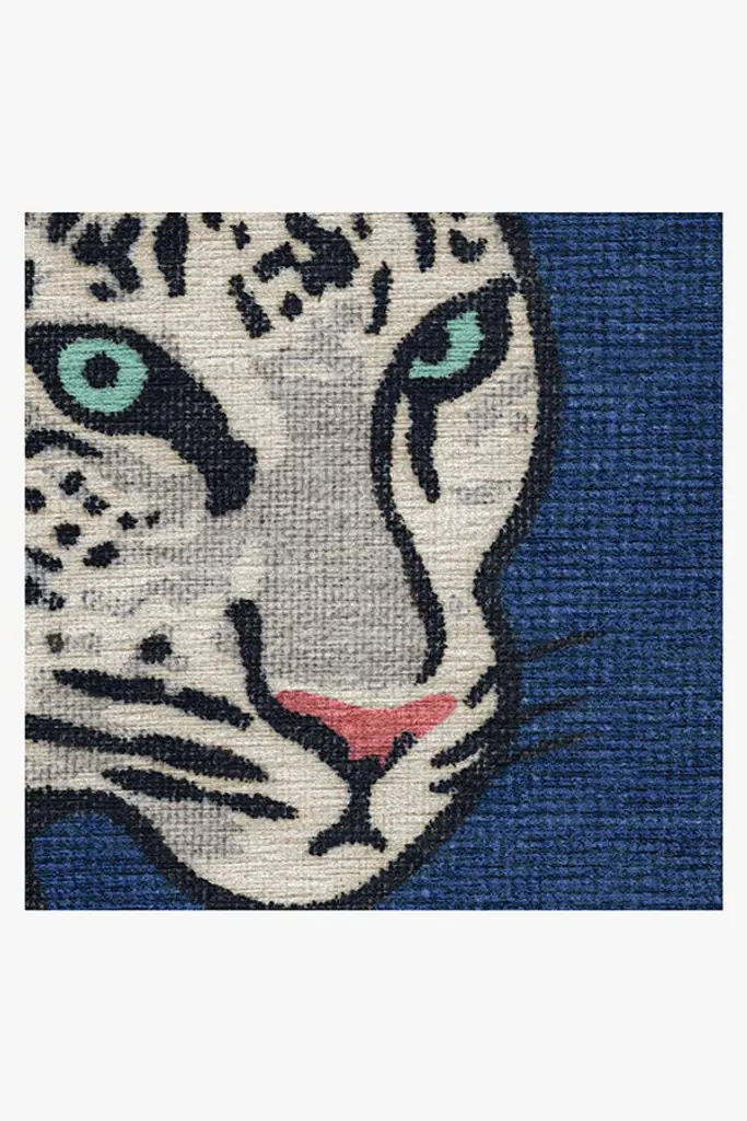 A favorite symbol of timeless glamour. Our Jonathan Adler Snow Leopard Sapphire Rug exudes drama with its off-white, light grey, and black cat on a needlepoint-textured sapphire blue background with a black border. Water-resistant, stain-resistant, and machine-washable.