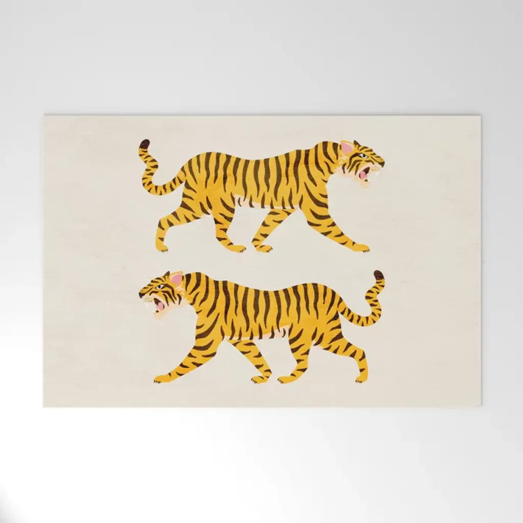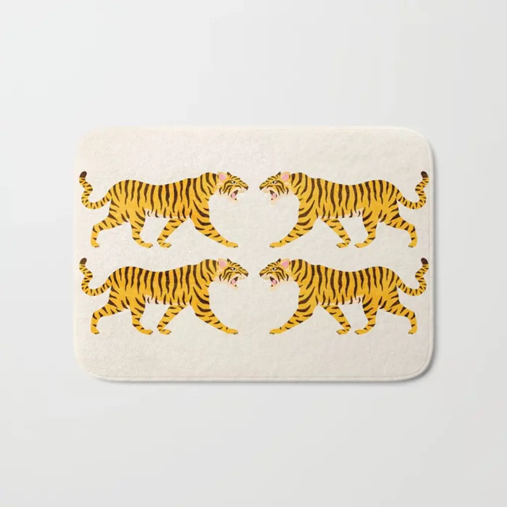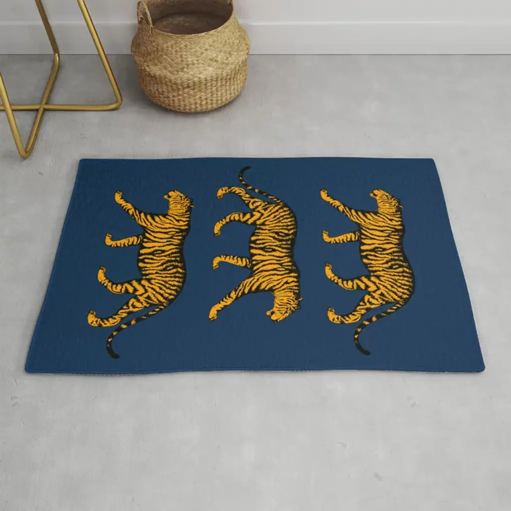 Wild cat chicness. Our Jonathan Adler Tiger Emerald Rug features an orange, cream, and black tiger sprawled across a rich emerald green background with a needlepoint texture across the design. Water-resistant, stain-resistant, and machine-washable.