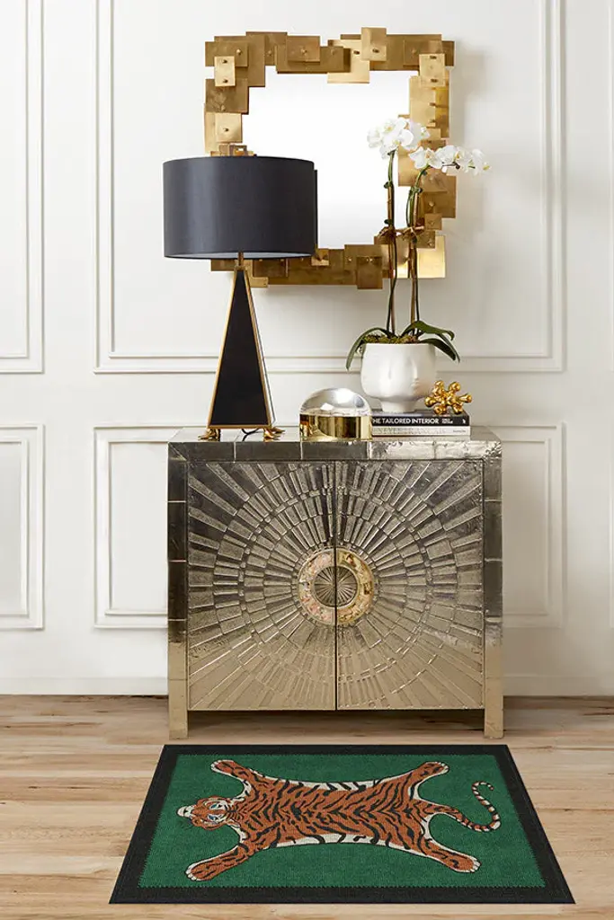 Wild cat chicness. Our Jonathan Adler Tiger Emerald Rug features an orange, cream, and black tiger sprawled across a rich emerald green background with a needlepoint texture across the design. Water-resistant, stain-resistant, and machine-washable.