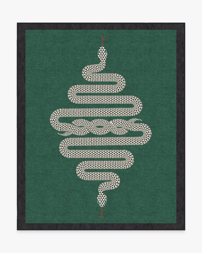 Sleek, sexy, and showstopping. This fierce rug features two black and white serpents sprawled on an emerald green background with a solid black border. Water-resistant, stain-resistant, and machine-washable.