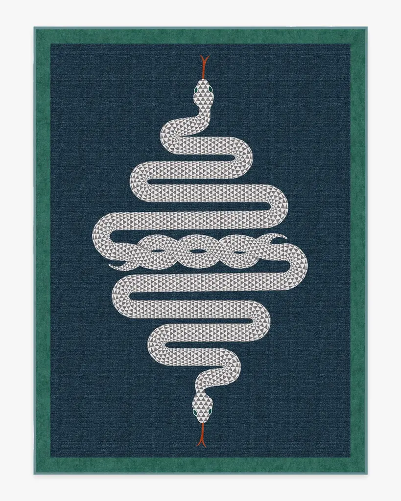 Sleek, sexy, and showstopping. This fierce rug features two black and white serpents sprawled on an emerald green background with a solid black border. Water-resistant, stain-resistant, and machine-washable.