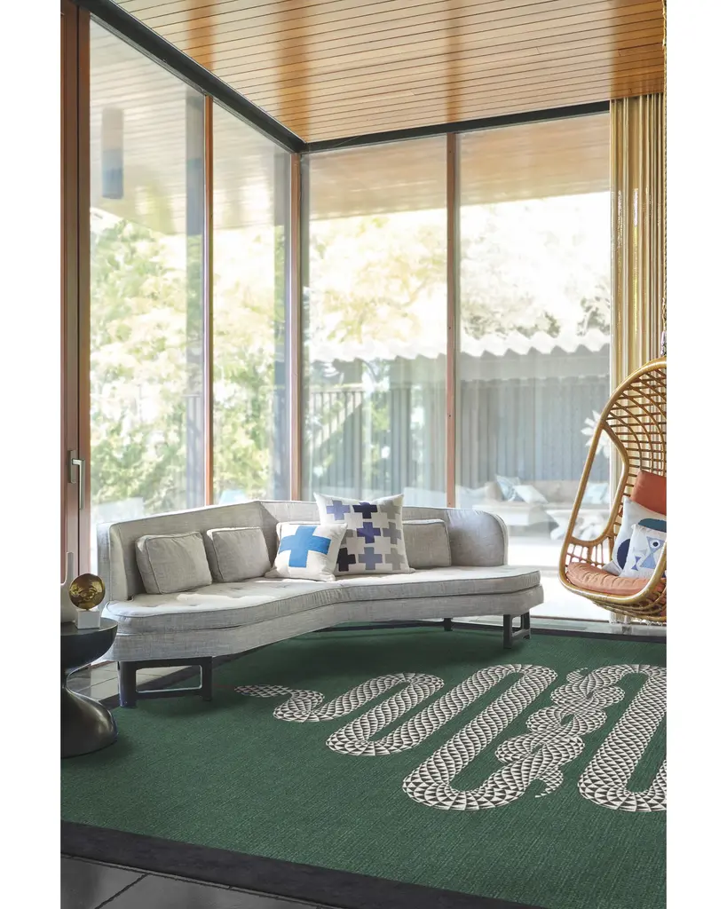 Sleek, sexy, and showstopping. This fierce rug features two black and white serpents sprawled on an emerald green background with a solid black border. Water-resistant, stain-resistant, and machine-washable.