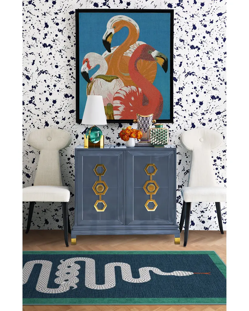 Chic and serpentine showstopper. This head-turning accent rug features two slithering serpents, intertwined on a sapphire blue background with a bottle-green border. Water-resistant, stain-resistant, and machine-washable.