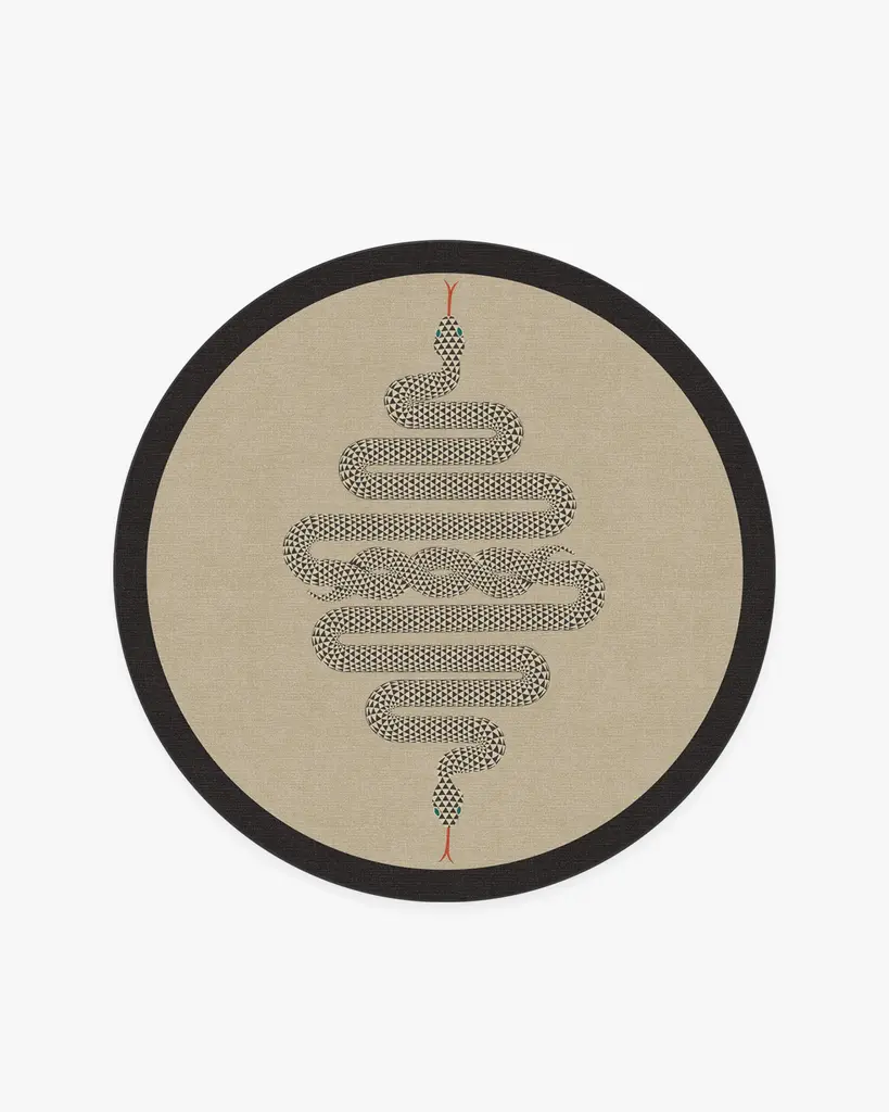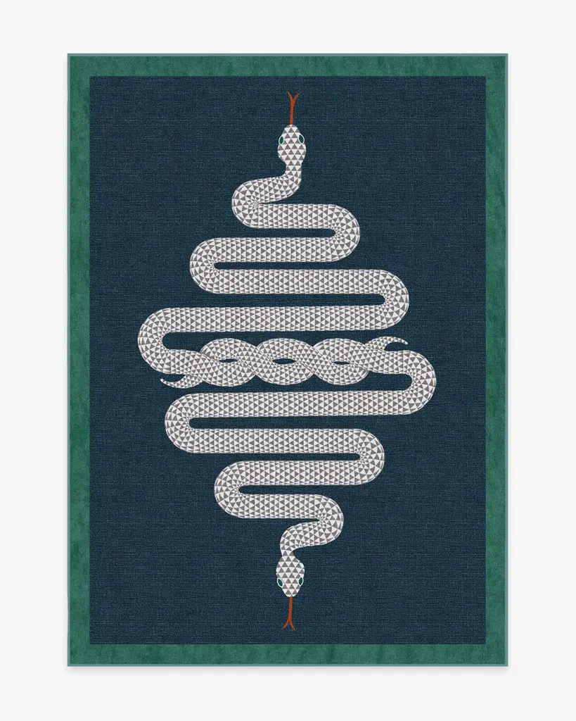 Chic and serpentine showstopper. This head-turning accent rug features two slithering serpents, intertwined on a sapphire blue background with a bottle-green border. Water-resistant, stain-resistant, and machine-washable.