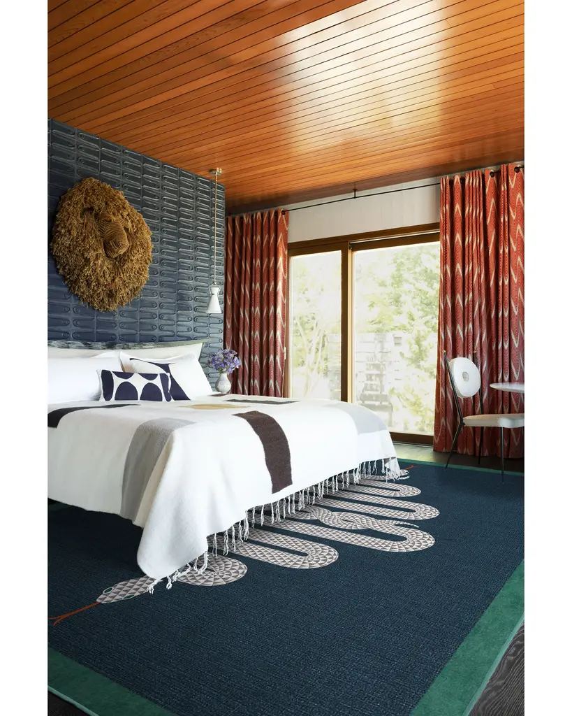 Chic and serpentine showstopper. This head-turning accent rug features two slithering serpents, intertwined on a sapphire blue background with a bottle-green border. Water-resistant, stain-resistant, and machine-washable.