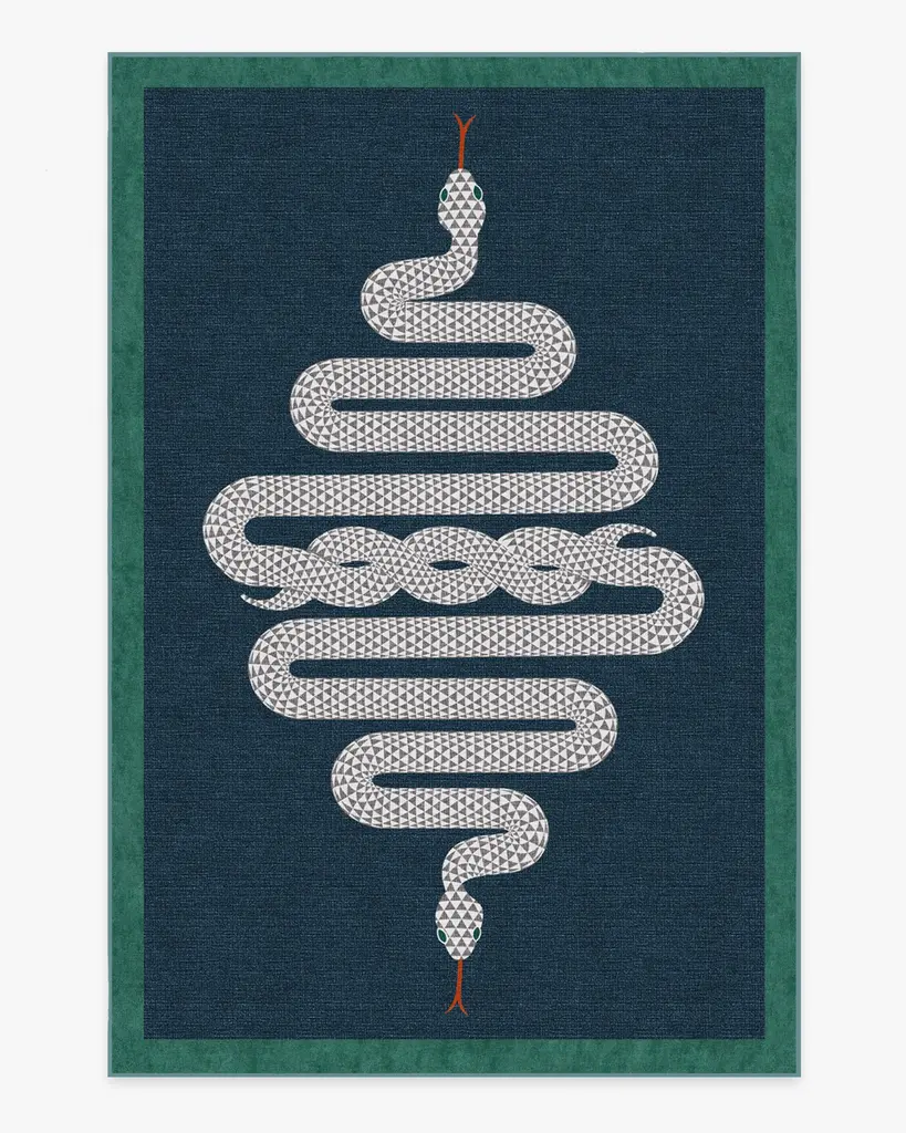 Chic and serpentine showstopper. This head-turning accent rug features two slithering serpents, intertwined on a sapphire blue background with a bottle-green border. Water-resistant, stain-resistant, and machine-washable.