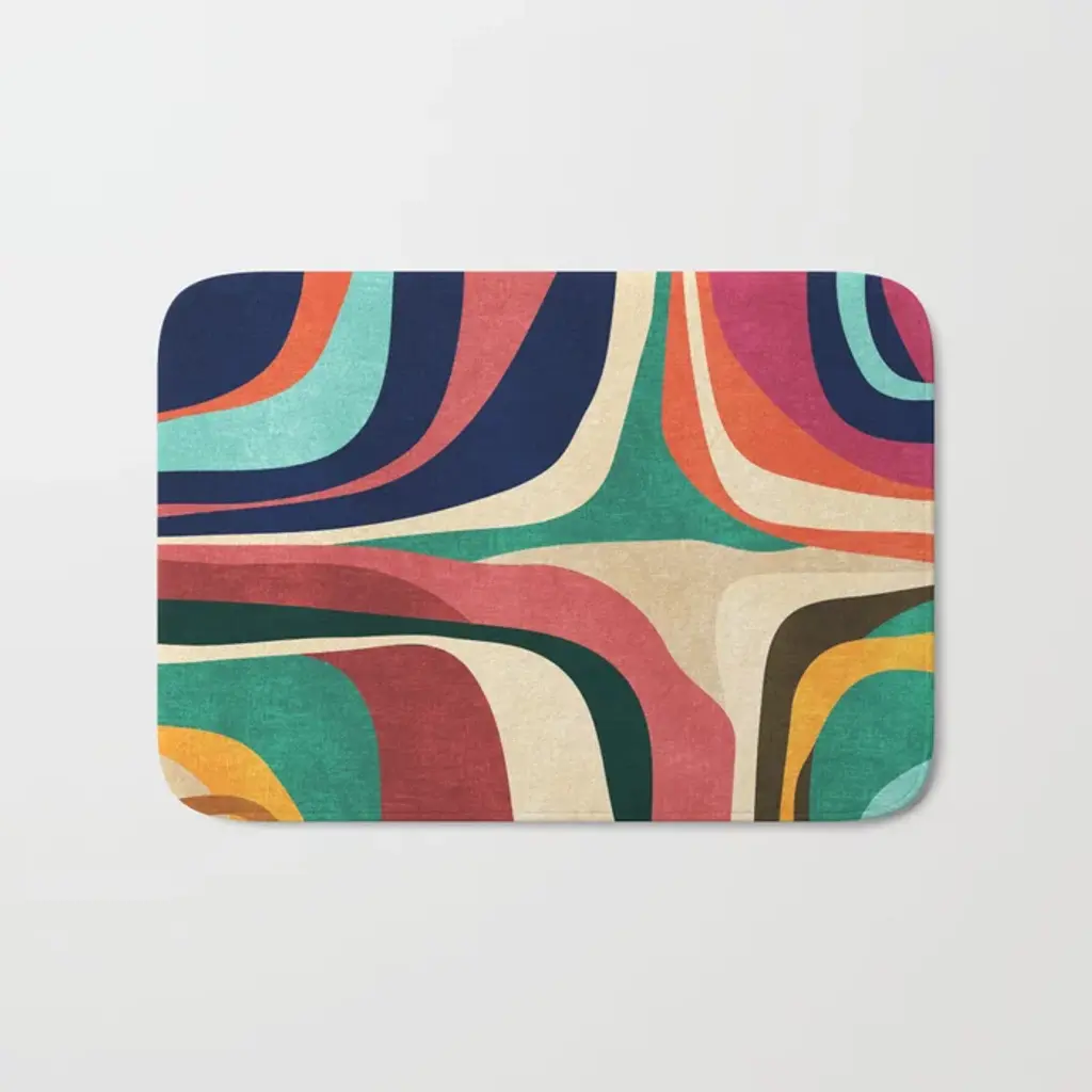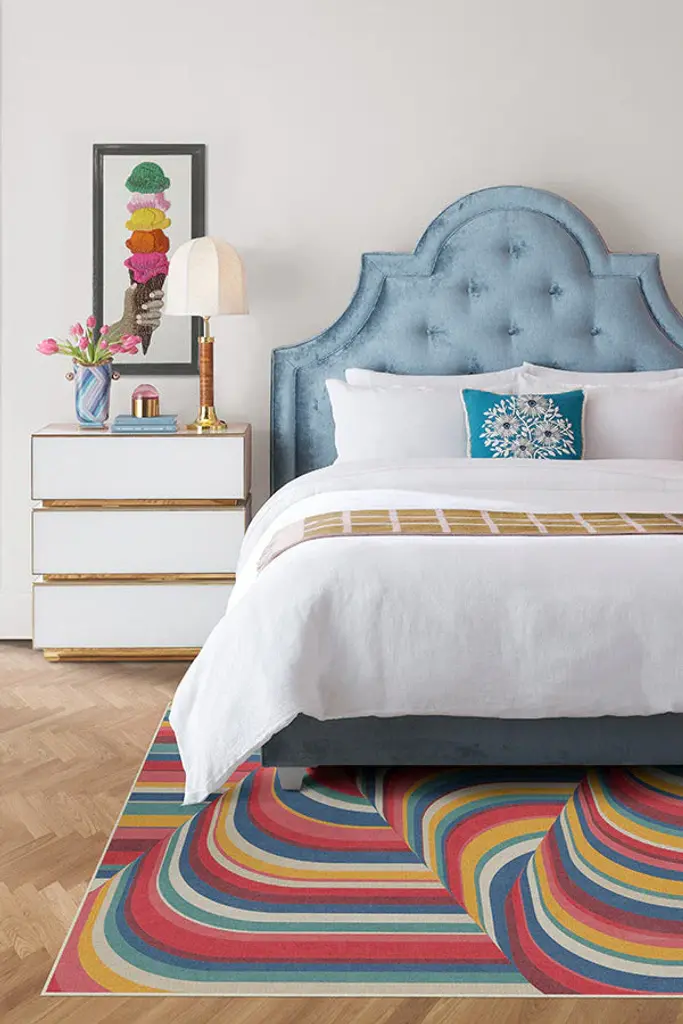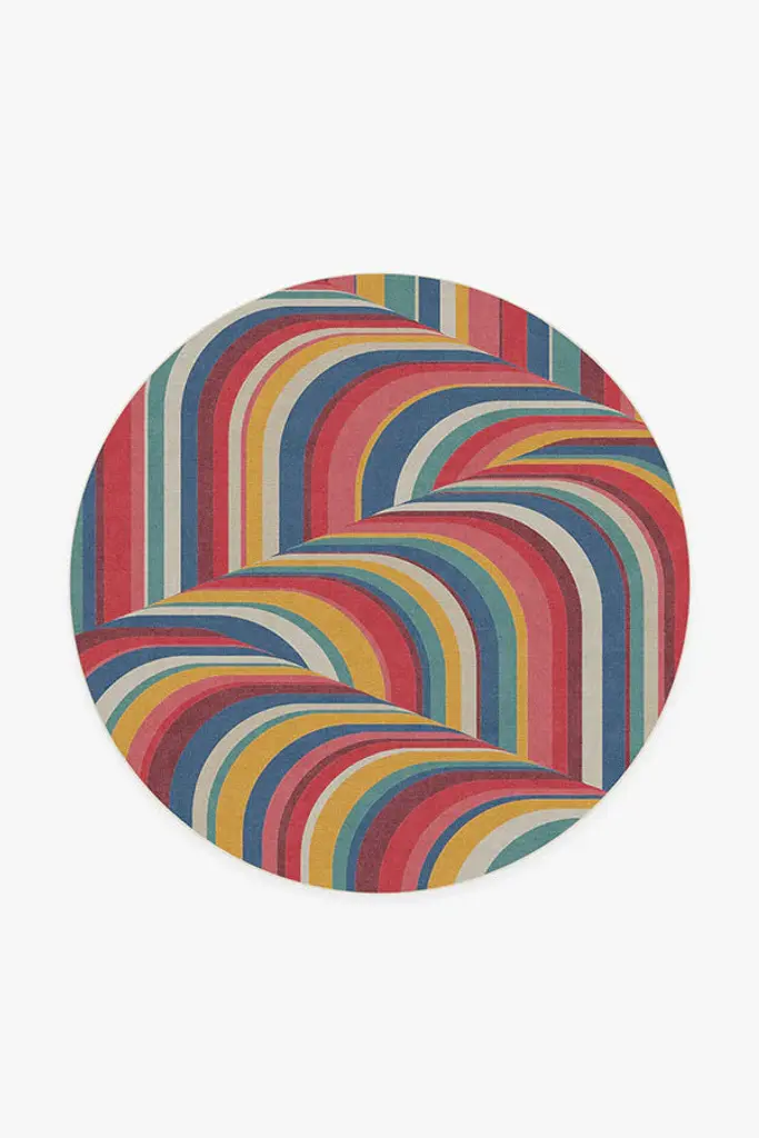 Graphic stripes create a curvy cascade of color and dimension. Our Jonathan Adler Waterfall Multicolor Rug features a vibrant palette of reds, blues, yellows, pinks, and pearl white that form a statement-making striped pattern. Water-resistant, stain-resistant, and machine-washable.