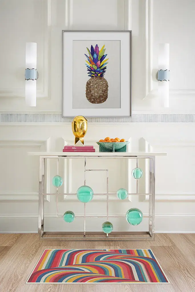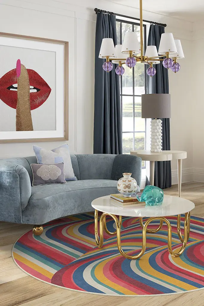 Graphic stripes create a curvy cascade of color and dimension. Our Jonathan Adler Waterfall Multicolor Rug features a vibrant palette of reds, blues, yellows, pinks, and pearl white that form a statement-making striped pattern. Water-resistant, stain-resistant, and machine-washable.