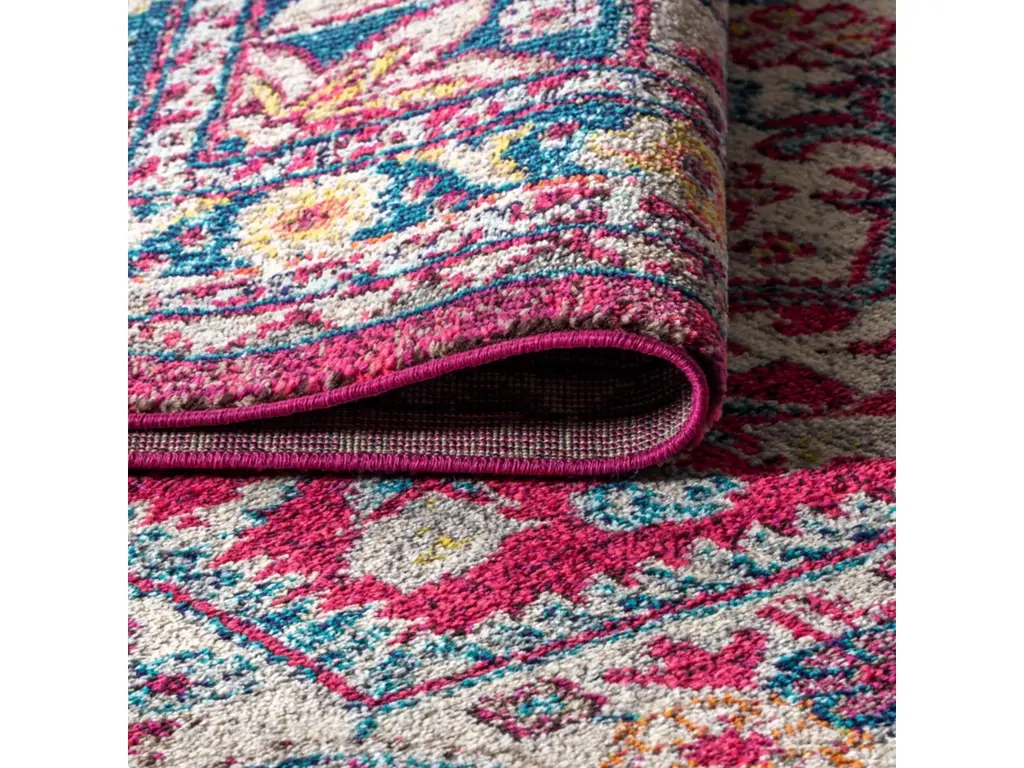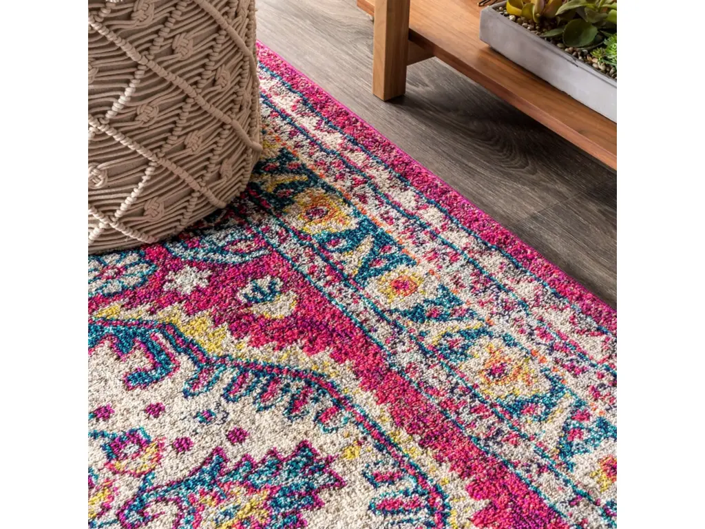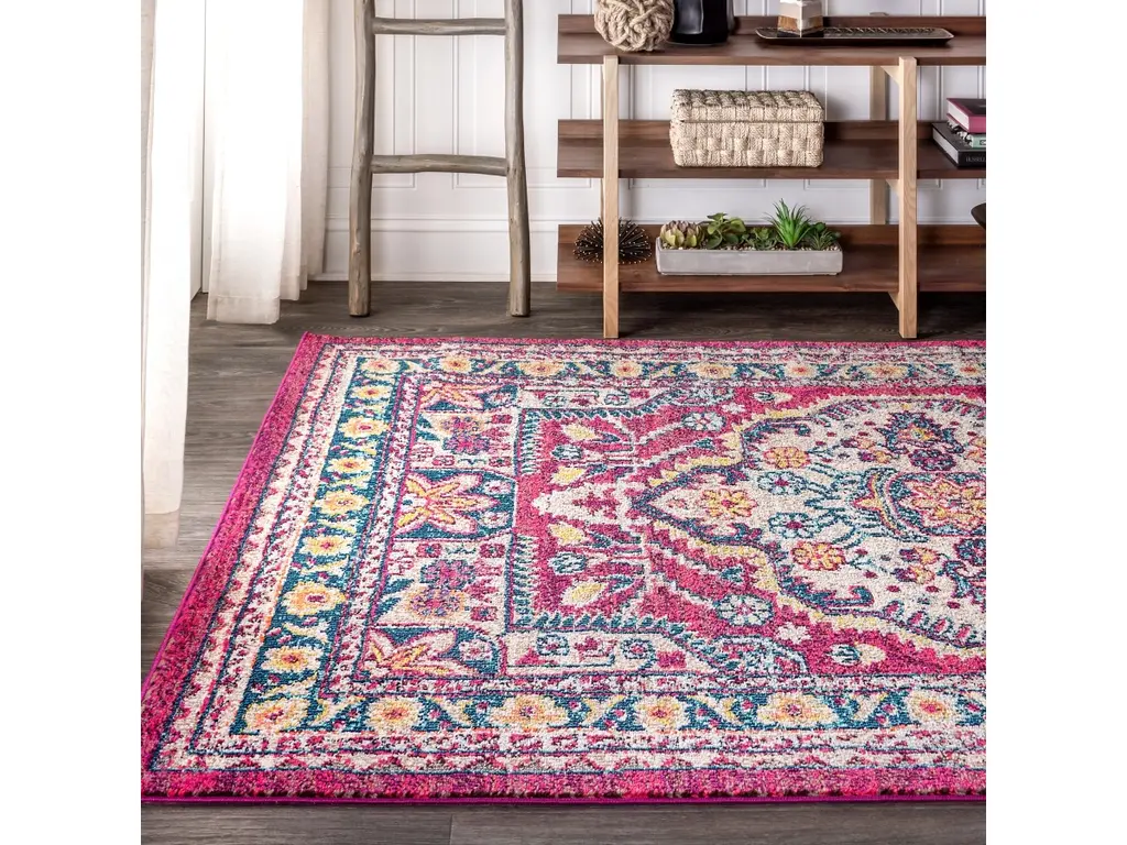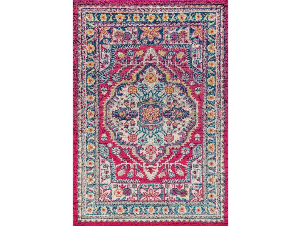 Old world style gets new life in a stunning fuchsia pink color in this bohemian rug inspired by the oriental masterpieces of antiquity. A large center medallion and thin border create an optical illusion that will make your space feel larger, all while creating a stunning accent for eclectic or modern decor. With only a 1/3" pile, it is durable enough for high traffic areas like a living room or foyer, but soft enough for bedrooms as well.