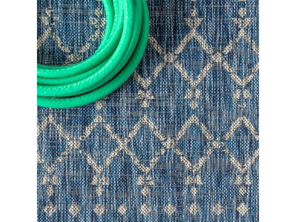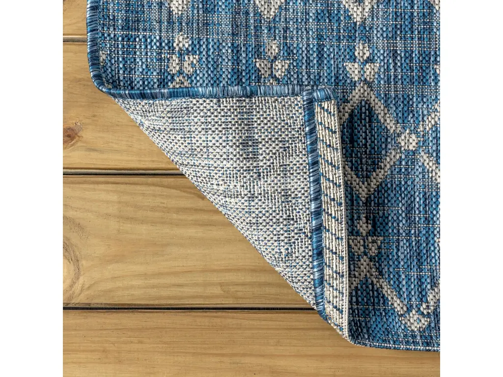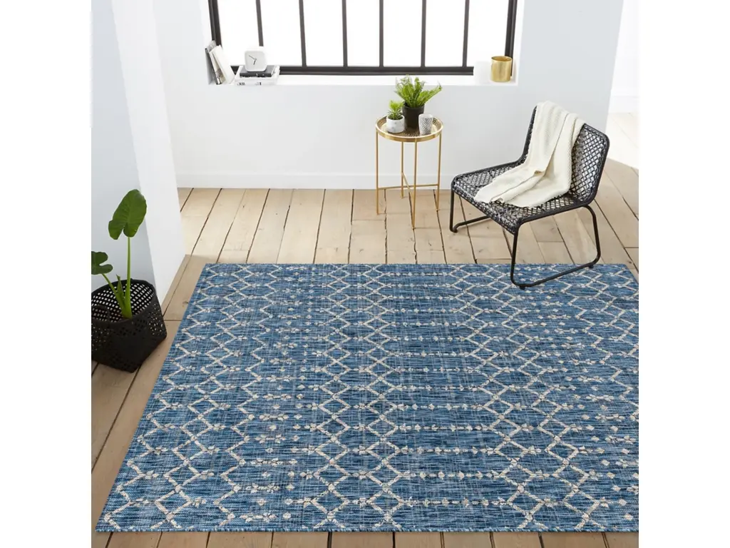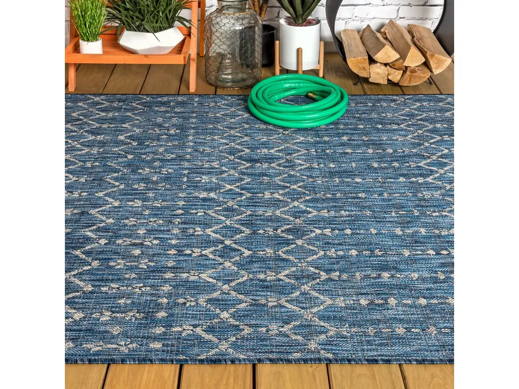 With its geometric design inspired by Moroccan tribal patterns, our Boho-chic rug adds eclectic style to an outdoor porch or patio. Varied tones of deep blues mingled with a light gray pattern give this rug a hand-woven, vintage vibe. The flatweave design is great for high-traffic spaces indoors too.