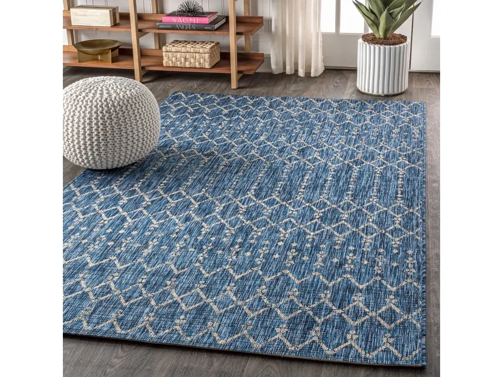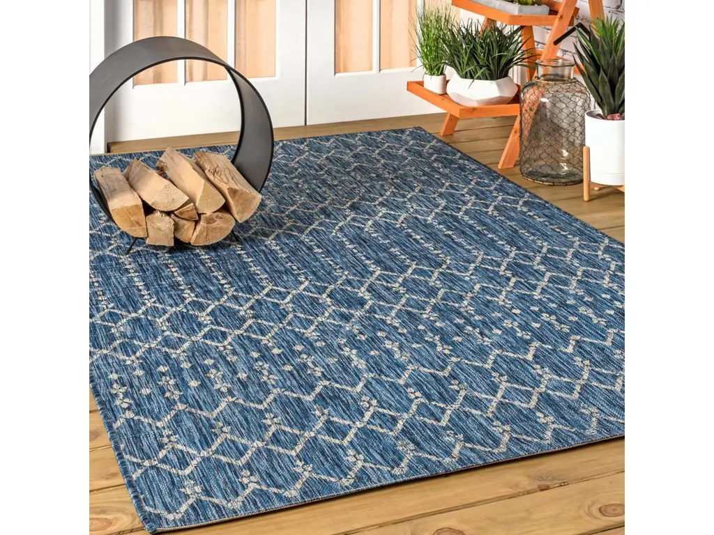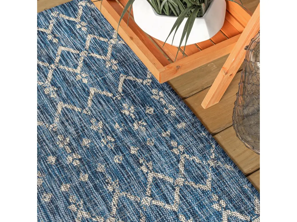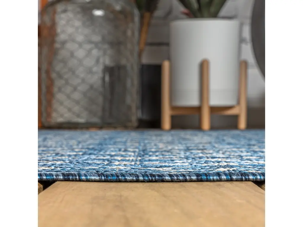 With its geometric design inspired by Moroccan tribal patterns, our Boho-chic rug adds eclectic style to an outdoor porch or patio. Varied tones of deep blues mingled with a light gray pattern give this rug a hand-woven, vintage vibe. The flatweave design is great for high-traffic spaces indoors too.