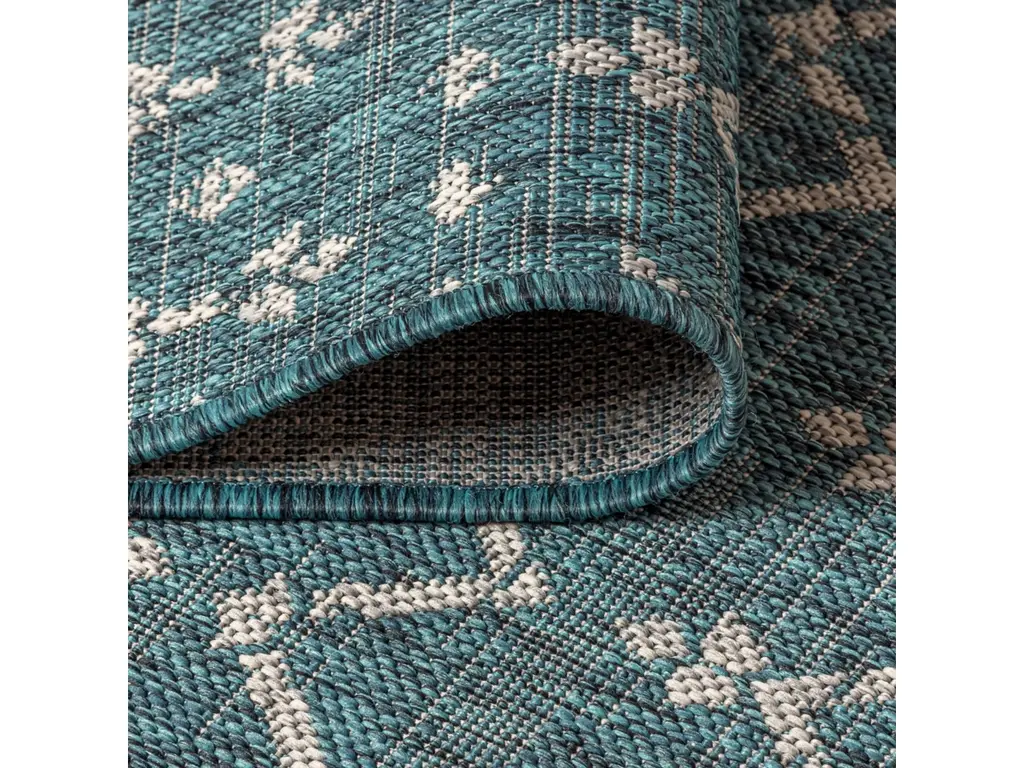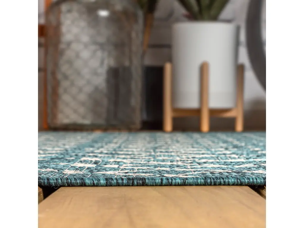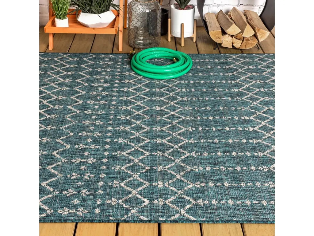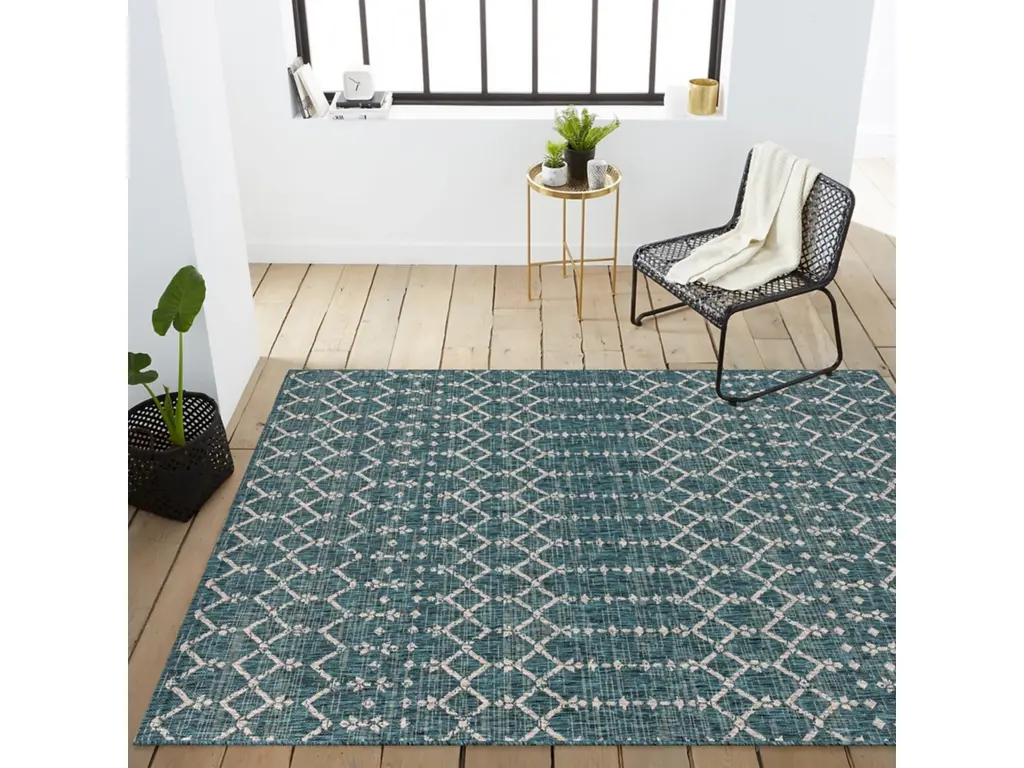 With its geometric design inspired by Moroccan tribal patterns, our Boho-chic rug adds eclectic style to an outdoor porch or patio. Varied tones of deep blues and teal mingled with a light gray pattern give this rug a hand-woven, vintage vibe. The flatweave design is great for high-traffic spaces indoors too.