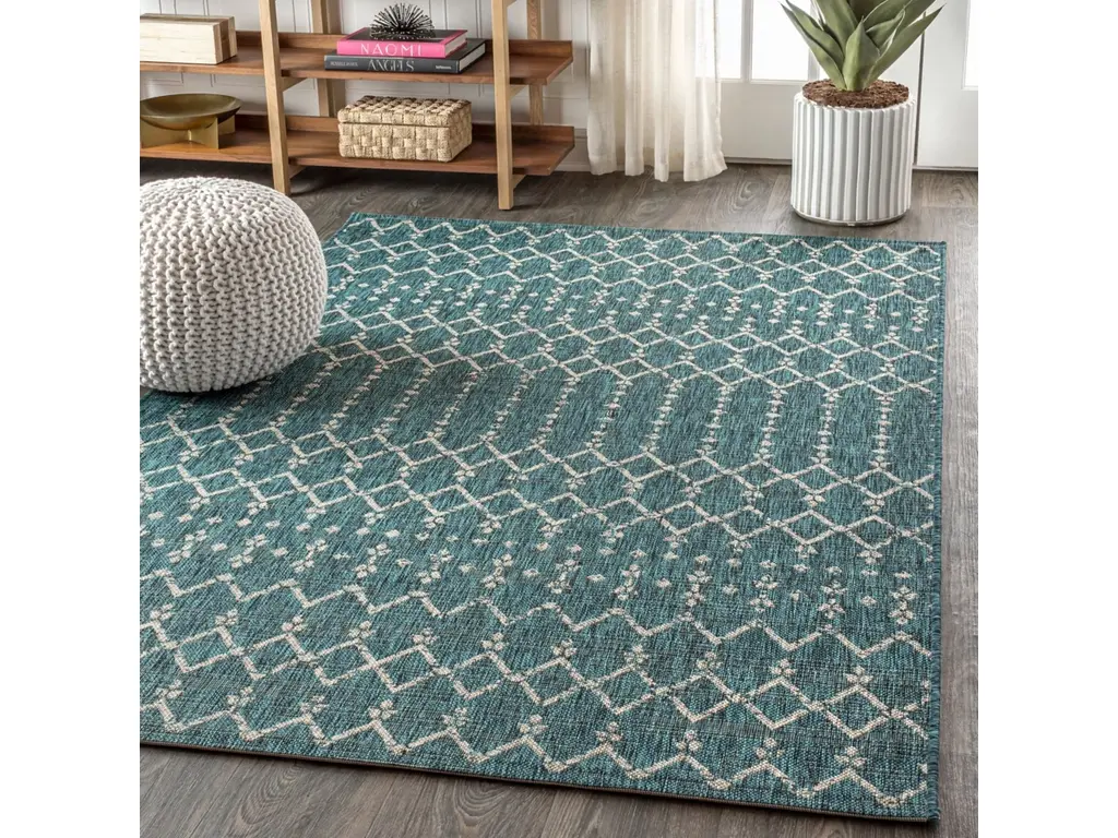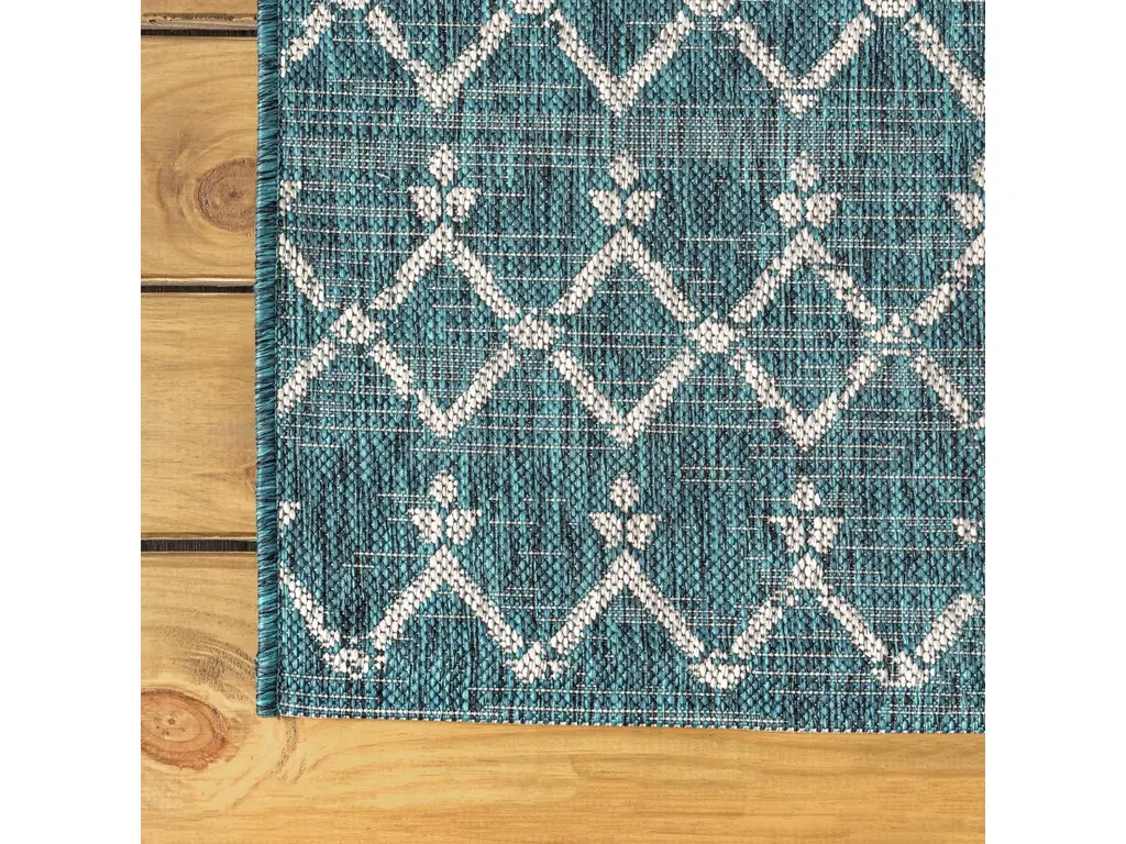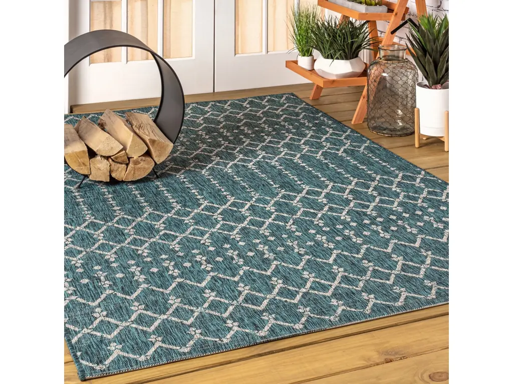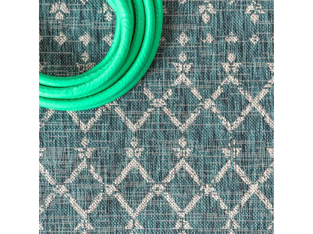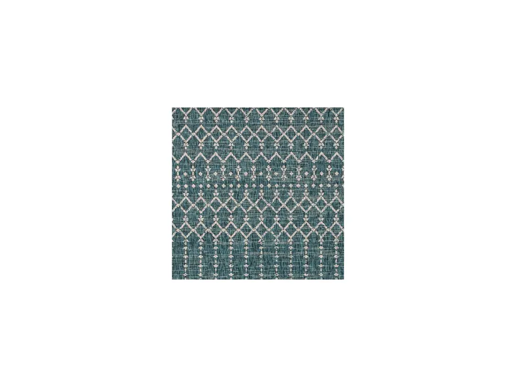 With its geometric design inspired by Moroccan tribal patterns, our Boho-chic rug adds eclectic style to an outdoor porch or patio. Varied tones of deep blues and teal mingled with a light gray pattern give this rug a hand-woven, vintage vibe. The flatweave design is great for high-traffic spaces indoors too.